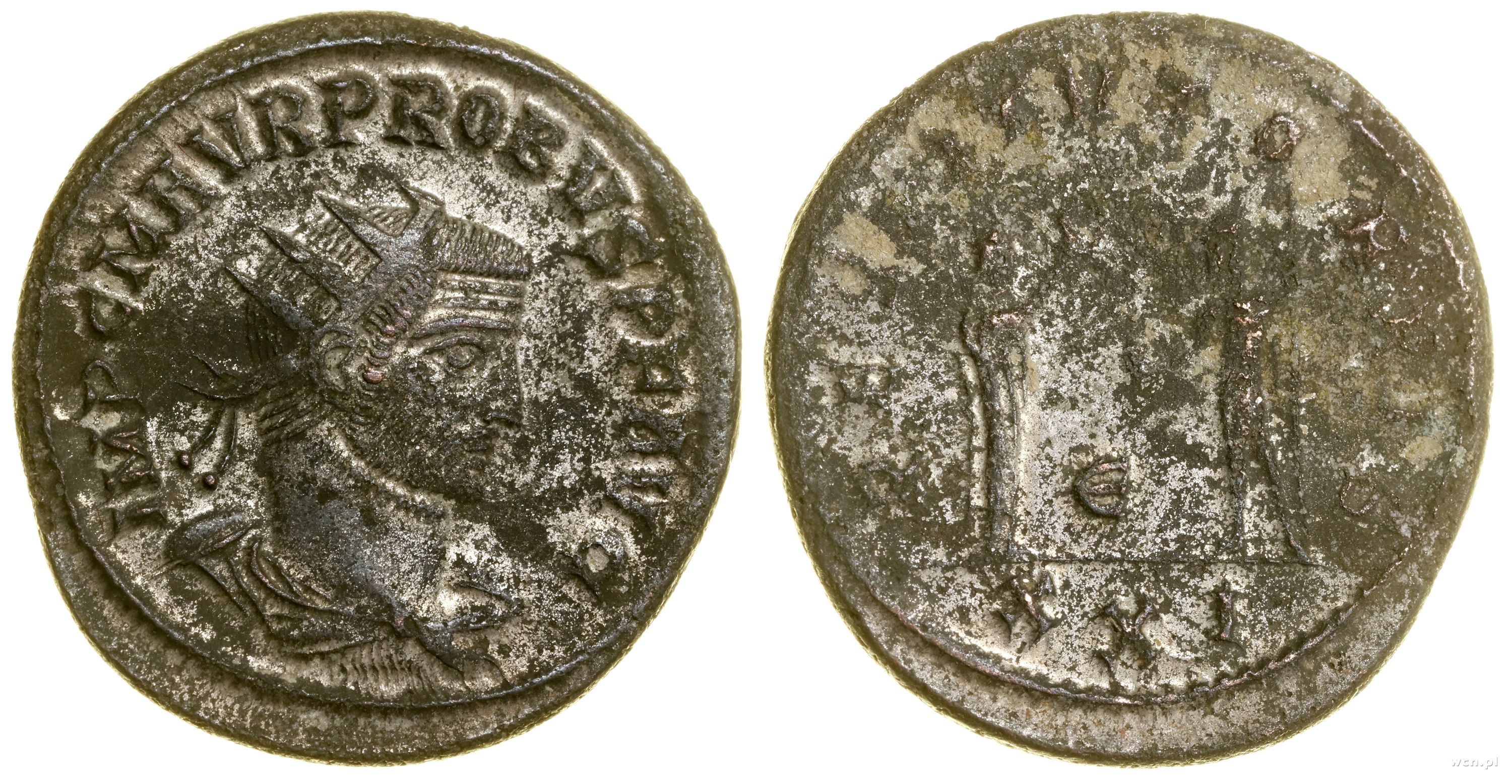 Aw: Popiersie cesarza w koronie radialnej w prawo, IMP C M AVR PROBVS P F AVG, Rw: Kobieta stojąca w prawo, pokazująca wieniec imperatorowi, stojącemu w lewo, trzymającemu berło i glob, RESTITVT ORBIS, w polu E, w odcinku XXI