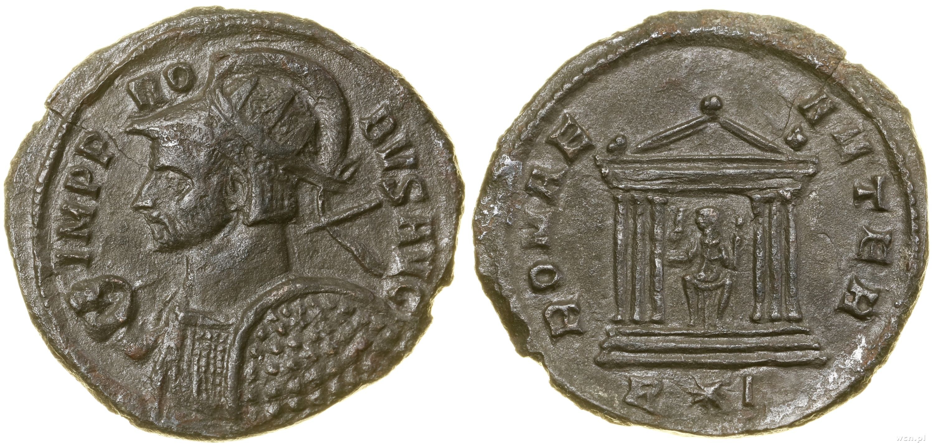 Aw: Popiersie cesarza w hełmie w lewo, IMP PROBVS AVG, Rw: Roma siedząca w sześciokolumnowej świątyni na tarczy w lewo, trzymająca Wiktorię i berło, ROMAE AETER, w odcinku R*I