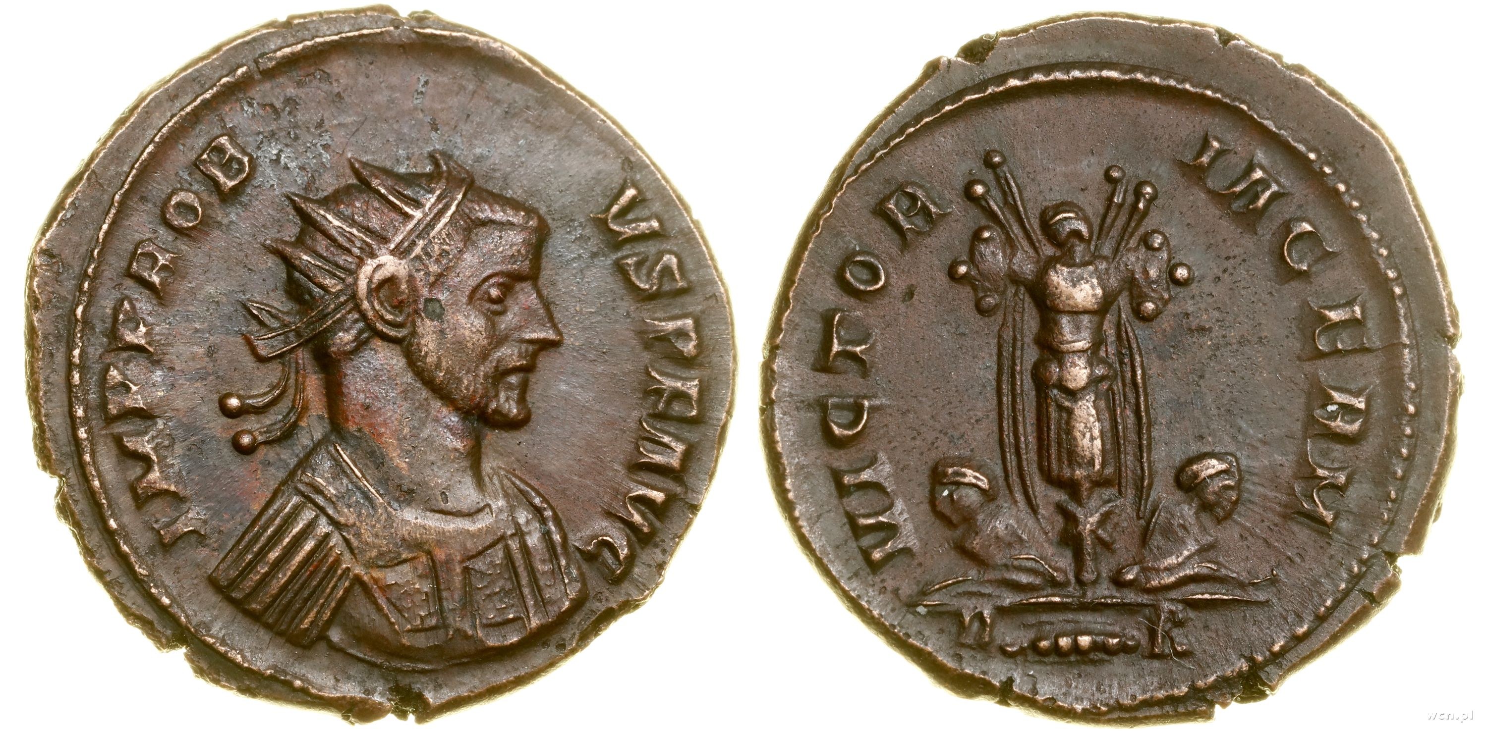 Aw: Popiersie cesarza w koronie radialnej w prawo, IMP PROBVS P F AVG; Rw: Dwaj jeńcy siedzący pod trofeum, VICTORIA GERM, w odcinku R(wiązka piorunów)A
