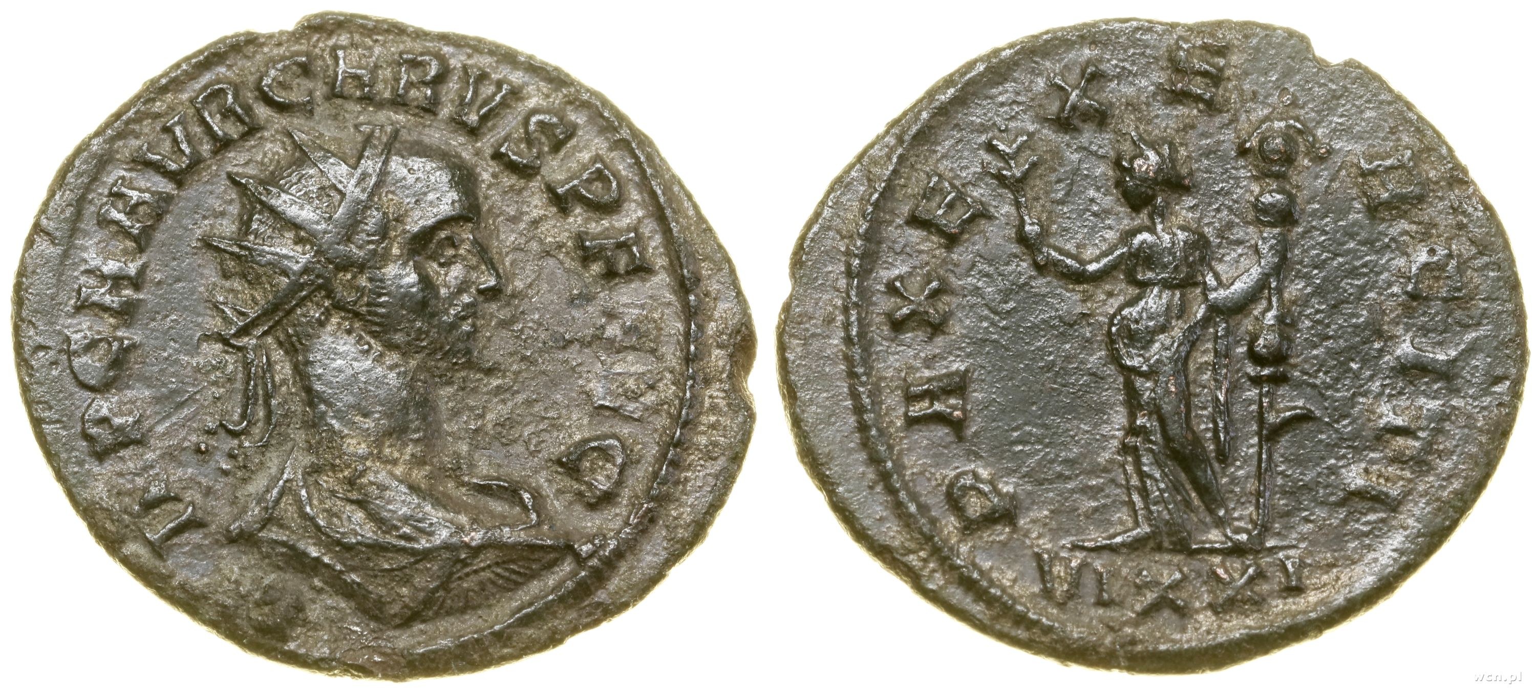 Aw: Popiersie cesarza w prawo, IMP C M AVR CARVS P F AVG; Rw: Pax stojąca w lewo, trzymająca gałązkę oliwną i sztandar legionowy, PAX EXERCITI, w odcinku VIXXI