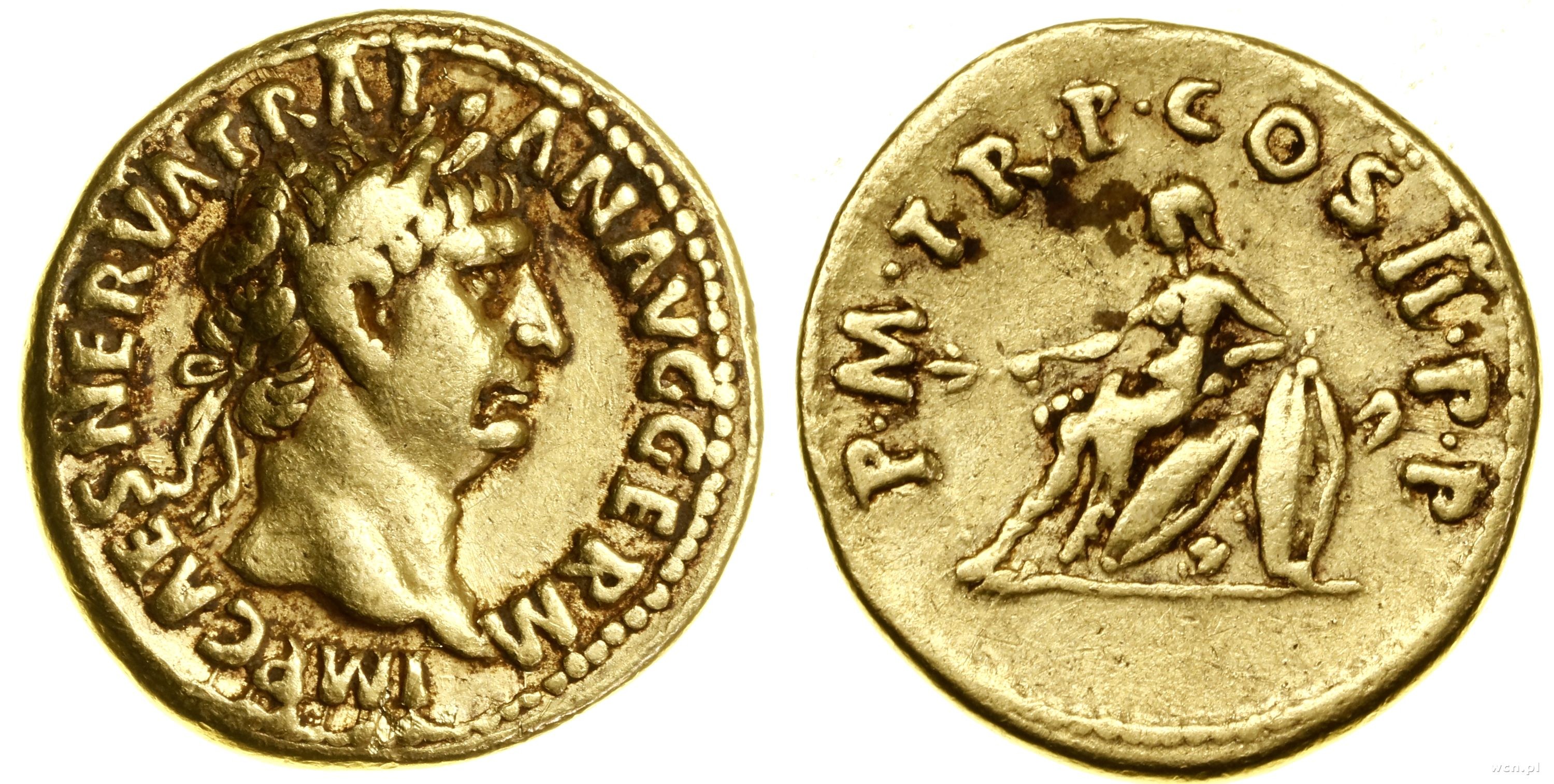 Aw: Głowa cesarza w wieńcu laurowym w prawo, IMP CAES NERVA TRAIAN AVG GERM, Rw: Germania siedząca na tarczach w lewo, trzyma gałązkę oliwną, P M TR P COS II P P