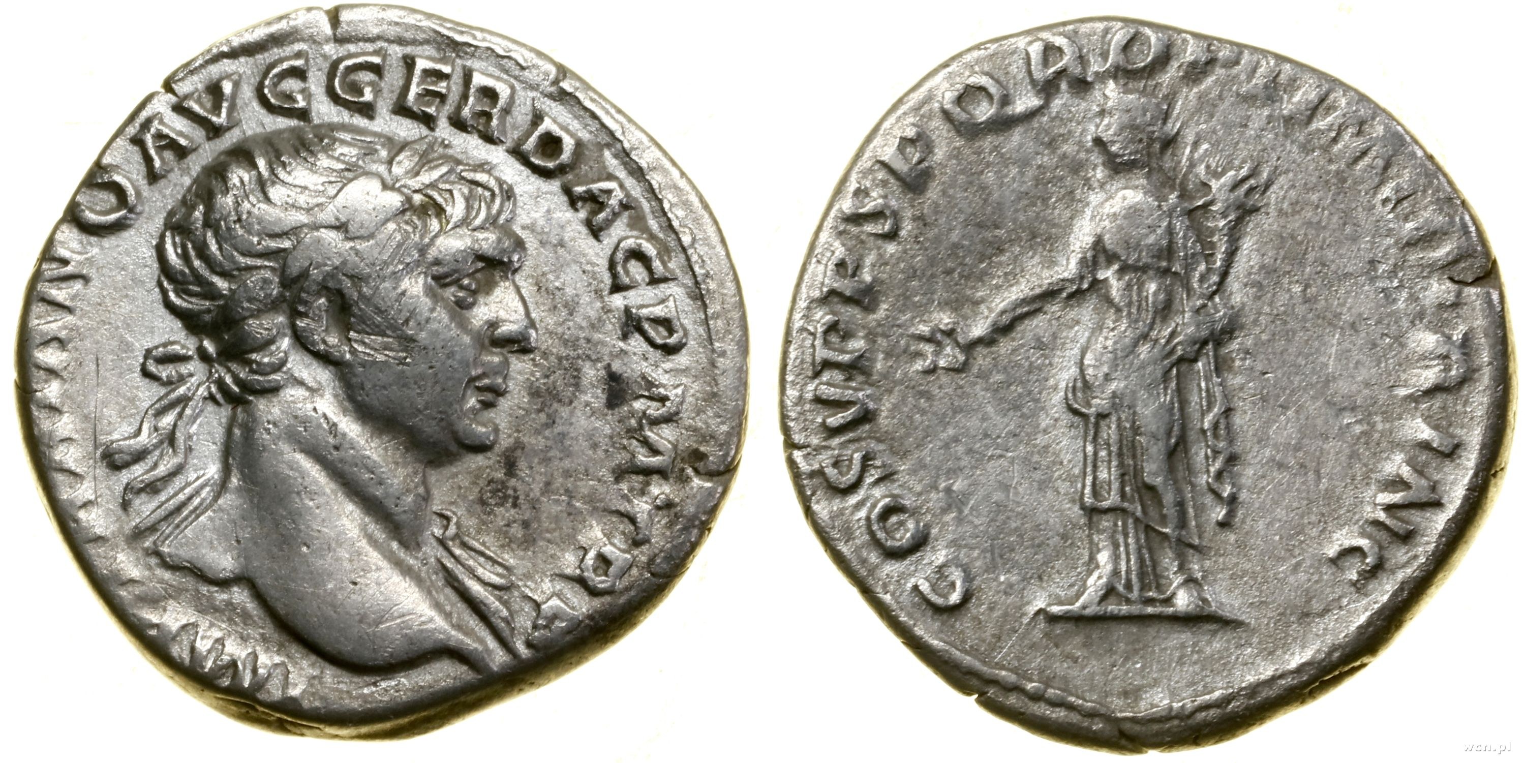 Aw: Popiersie cesarza w wieńcu laurowym w prawo, IMP TRAIANO AVG GER DAC P M TR P, Rw: Felicitas stojąca na wprost, trzymająca kaduceusz i róg obfitości, COS V P P S P Q R OPTIMO PRINC