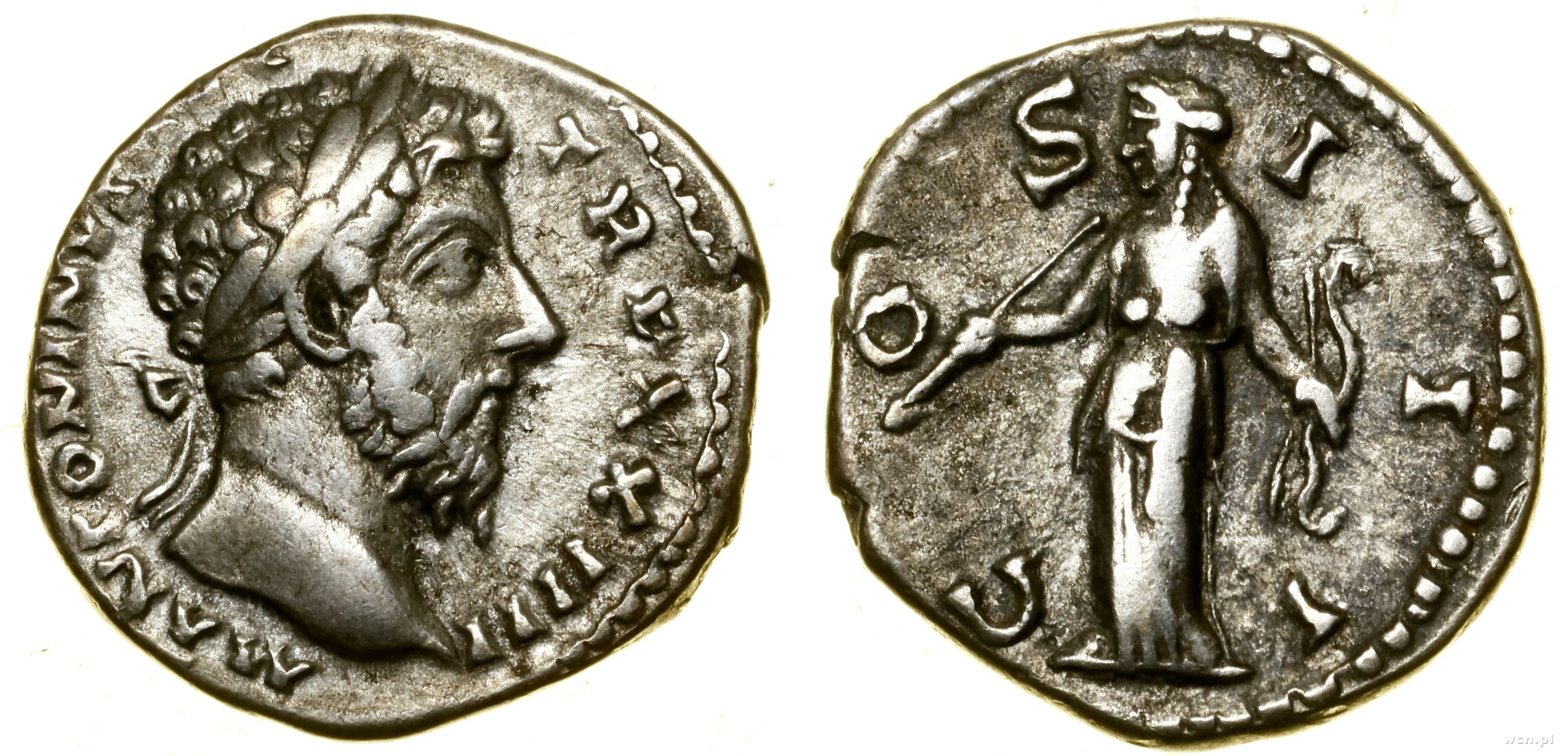 Aw: Popiersie cesarza w wieńcu laurowym w prawo, M ANTONINVS AVG TR P XXIIII, Rw: Diana stojąca w lewo, trzymająca łuk i strzałę, COS III