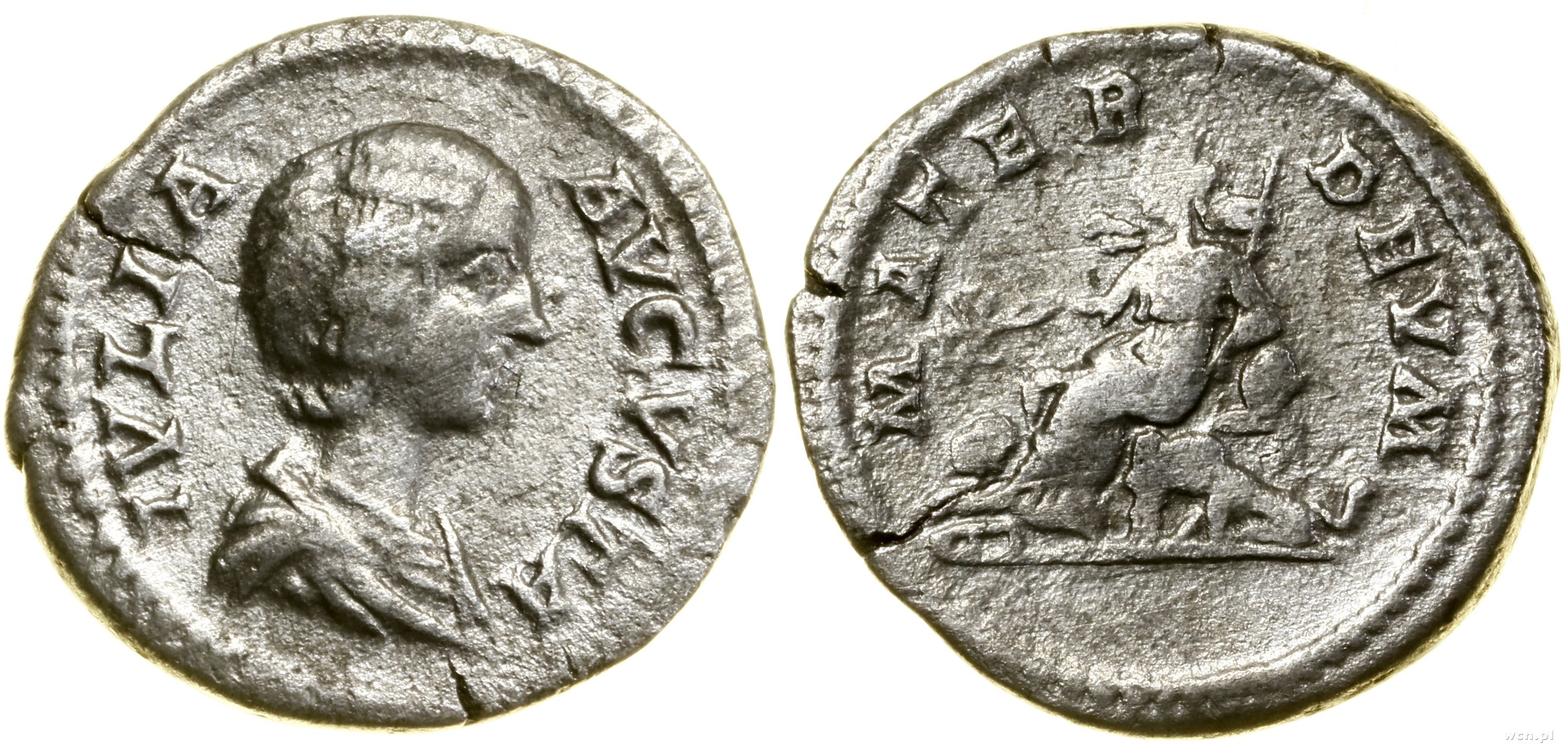 Aw: Popiersie cesarzowej w prawo i napis IVLIA AVGVSTA, Rw: Siedząca na tronie w lewo Cybele pomiędzy dwoma lwami, trzymająca gałązkę w prawej dłoni, lewa ręka na bębnie, wokoło napis MATER DEVM