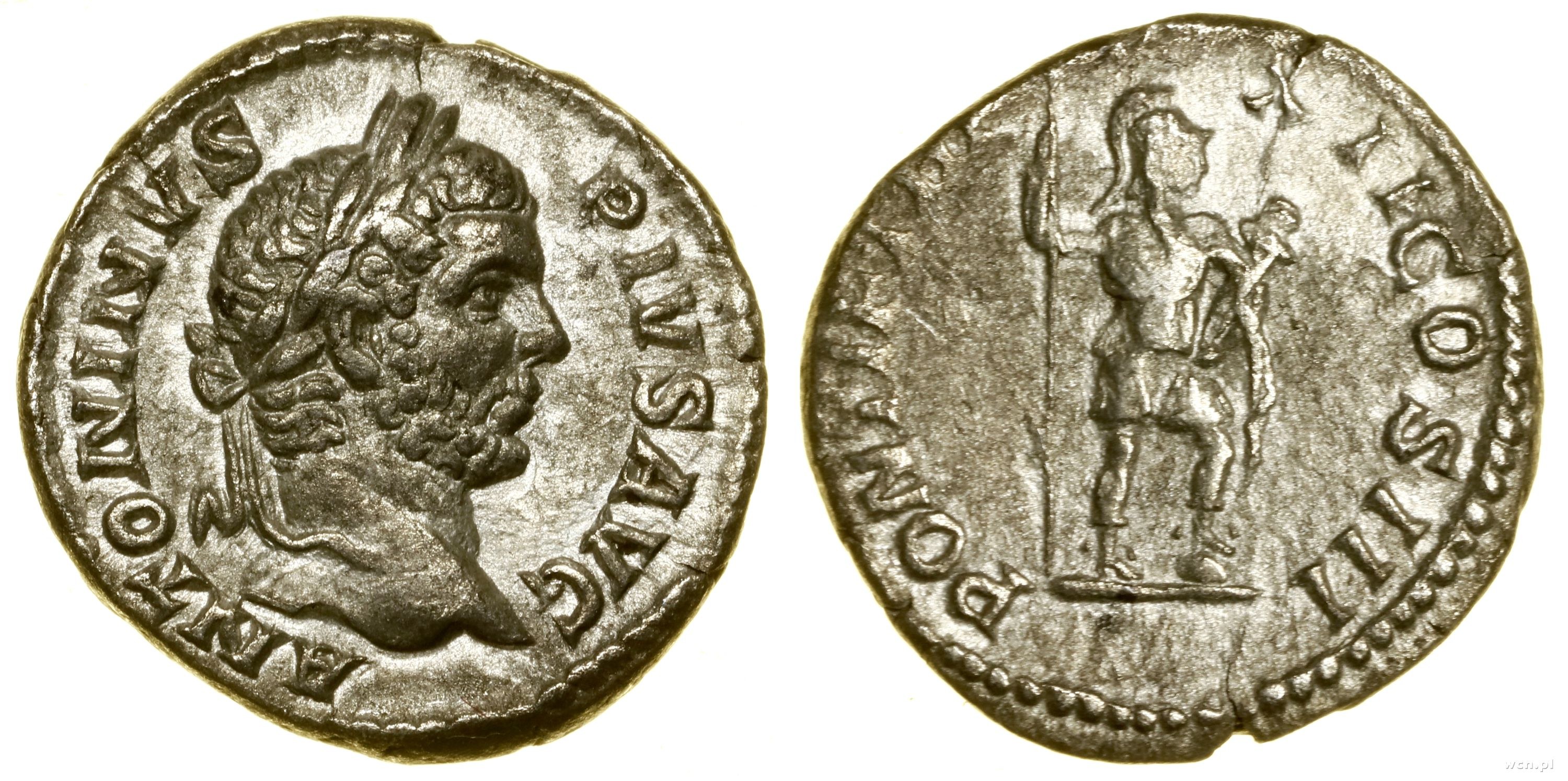 Aw: Głowa cesarza w wieńcu, ANTONINVS PIVS AVG, Rw: Virtus stojący w prawo z włócznią i parazonium, lewa noga na hełmie, PONTIF TR P XII COS III