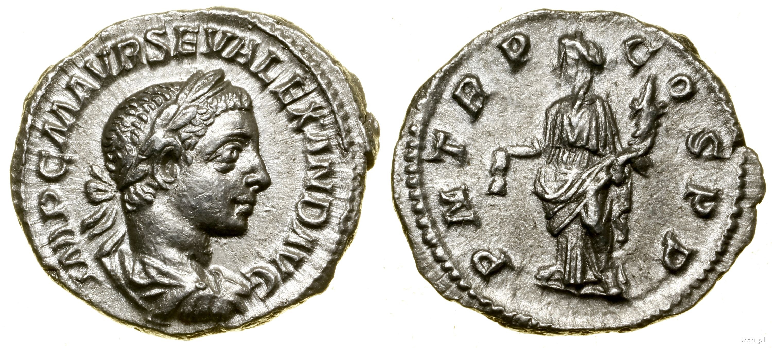 Aw: Popiersie cesarza w prawo, w wieńcu laurowym, IMP C M AVR SEV ALEXAND AVG, Rw: Libertas stojąca w lewo, trzymająca pileus i róg obfitości, P M TR P COS P P