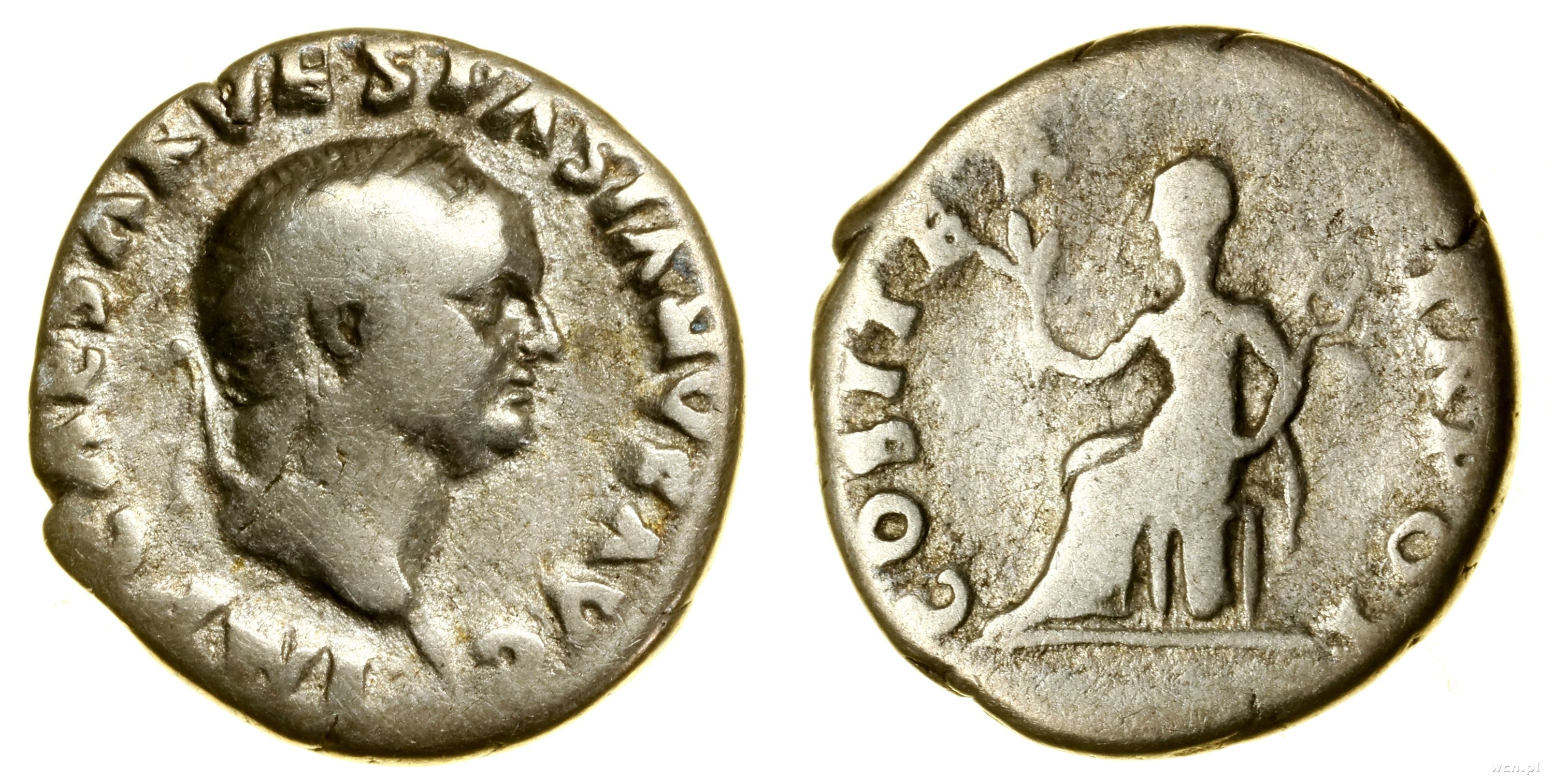 Aw: Głowa cesarza w prawo, IMP CAESAR VESPASIANVS AVG; Rw: Pax siedząca w lewo, trzymająca gałązkę oliwną i kaduceusz, COS ITER TR POT