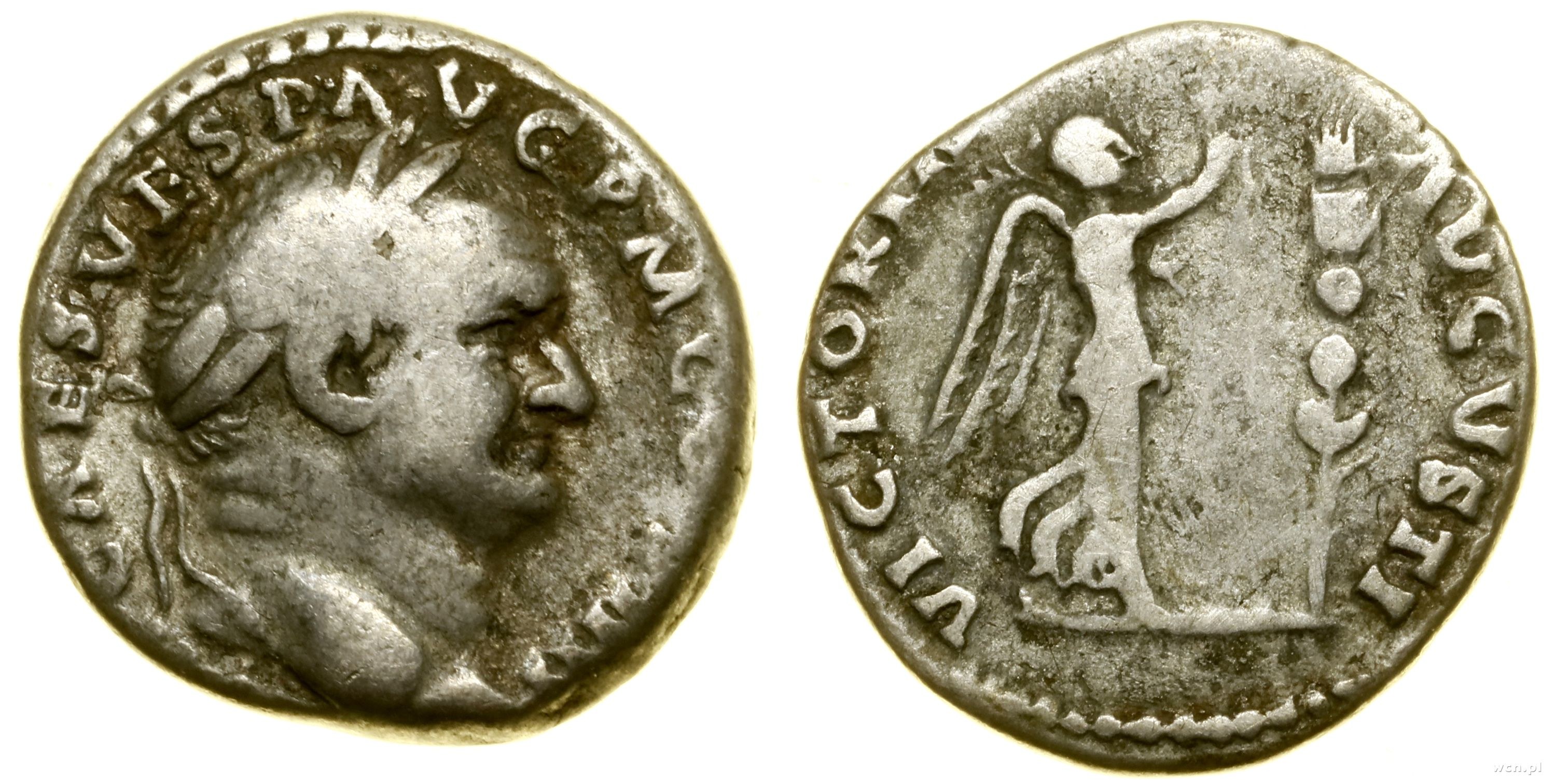 Aw: Głowa cesarza w wieńcu laurowym w prawo, IMP CAES VESP AVG P M COS IIII; Rw: Wiktoria krocząca w prawo, trzymająca gałązkę palmową oraz zakładająca wieniec na trofeum, VICTORIA AVGVSTI