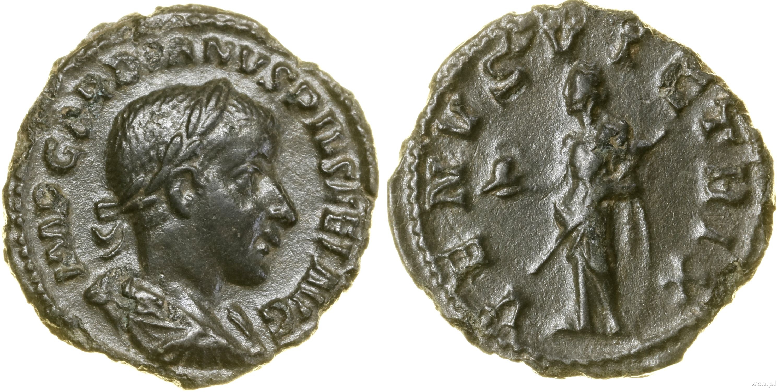 Aw: Popiersie cesarza w wieńcu laurowym w prawo, legenda IMP GORDIANVS PIVS FEL AVG; Rw: Wenus stojąca w lewo, trzymająca hełm i berło, wsparta na tarczy, legenda VENVS VICTRIX