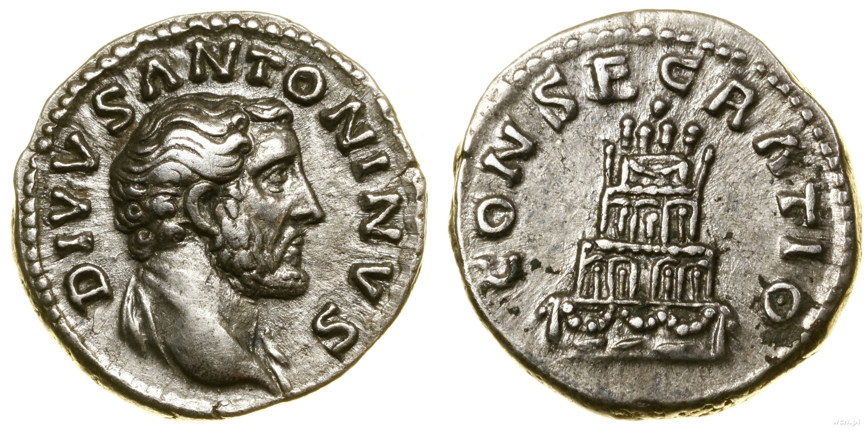 Aw: Głowa cesarza w prawo, DIVVS ANTONINVS; Rw: Stos pogrzebowy złożony z czterech kondygnacji, CONSECRATIO