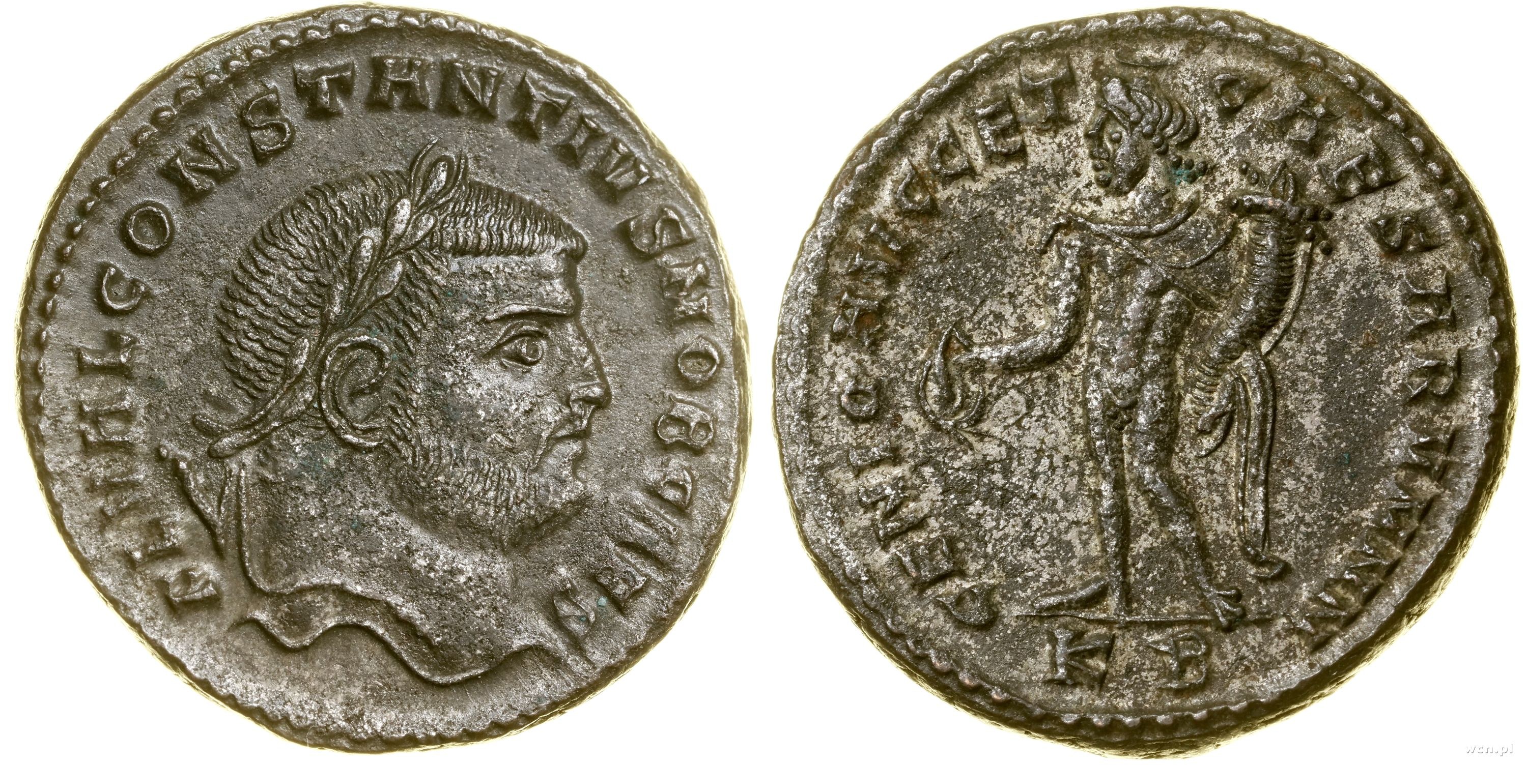 Aw: Głowa cezara w wieńcu laurowym w prawo, FL VAL CONSTANTIVS NOB CAES, Rw: Geniusz stojący w lewo, z modiusem na głowie, trzymający róg obfitości i paterę, GENIO AVGG ET CAESARVM N N, w odcinku KB