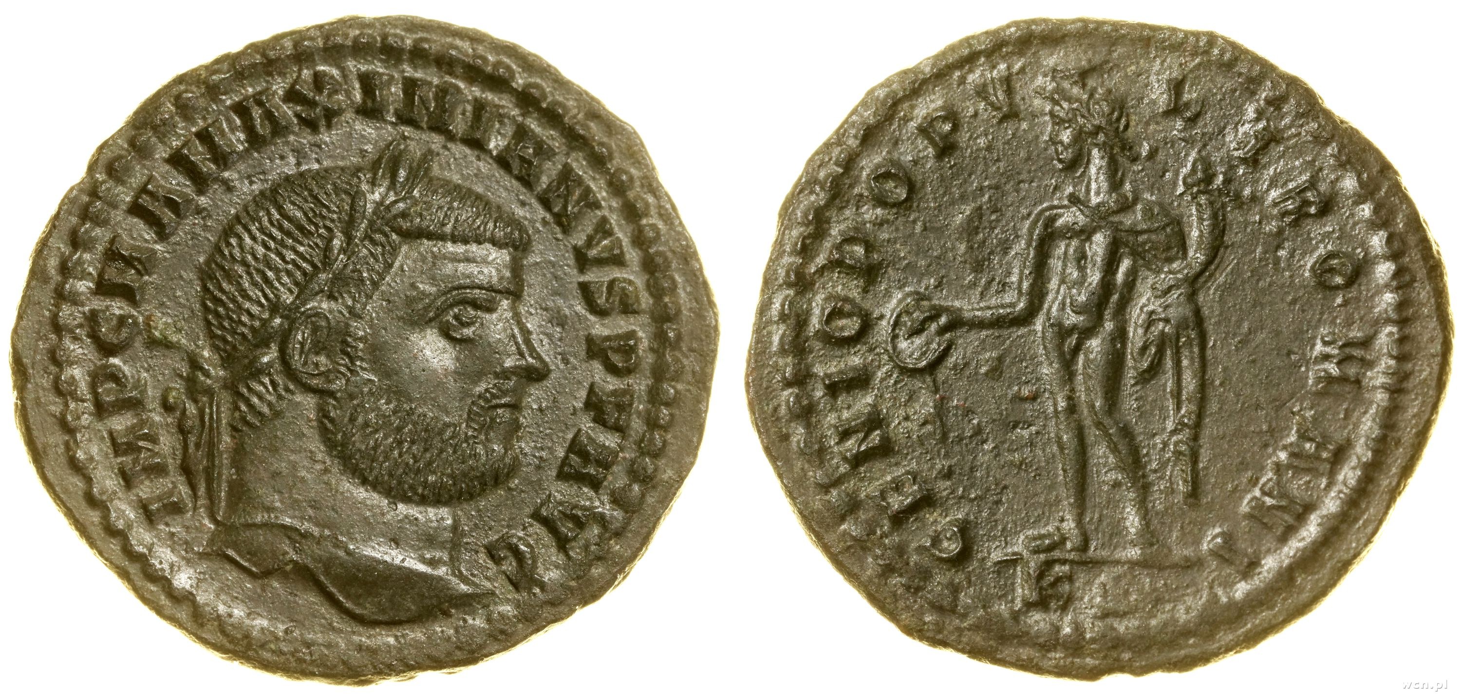 Aw: Głowa cesarza w wieńcu laurowym w prawo, IMP C M A MAXIMIANVS P F AVG, Rw: Geniusz stojący w lewo, trzymający róg obfitości i paterę, GENIO POPVLI ROMANI, w odcinku KΔ