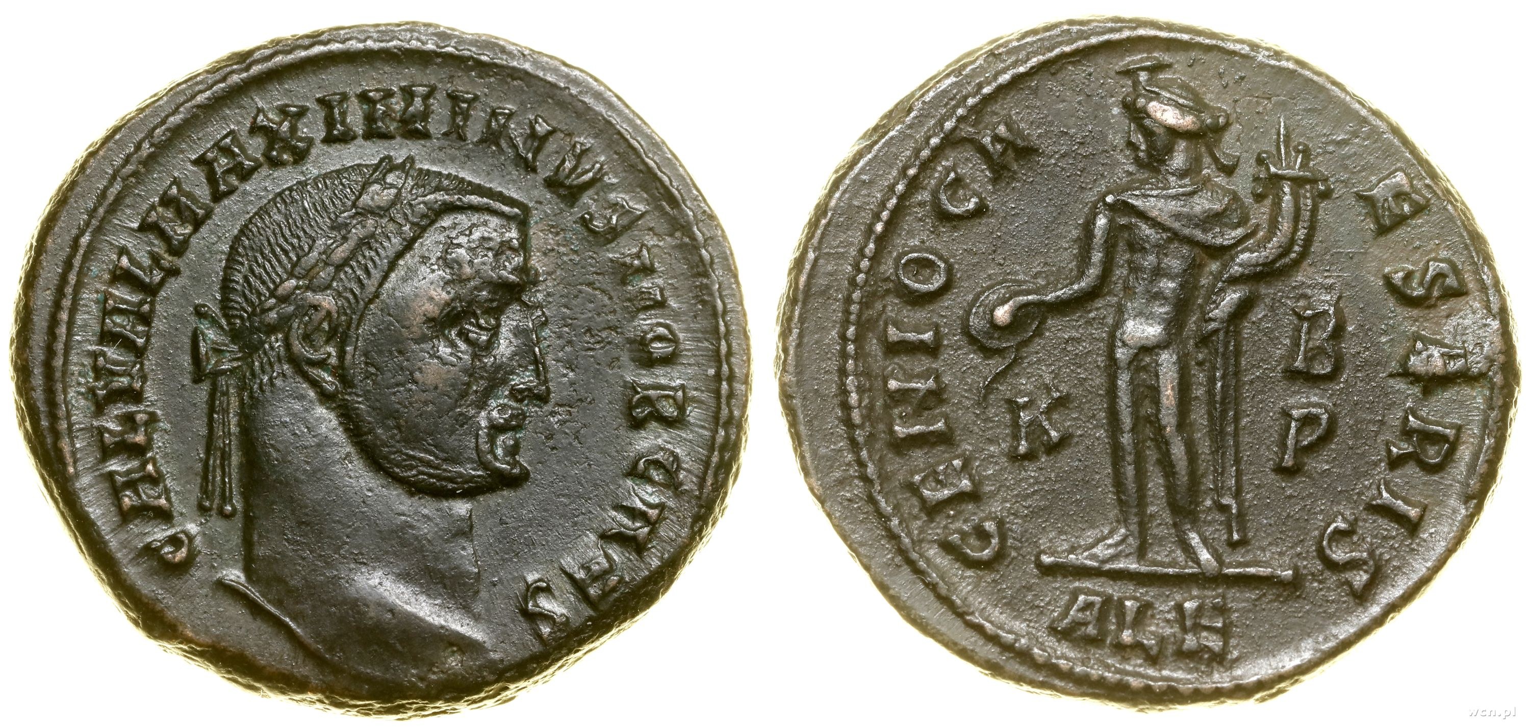 Aw: Głowa władcy w prawo, GAL VAL MAXIMINVS NOB CAES; Rw: Geniusz stojący w lewo z modiusem na głowie, trzymający paterę i róg obfitości, GENIO CAESARIS, w polu K oraz B P, w odcinku ALE