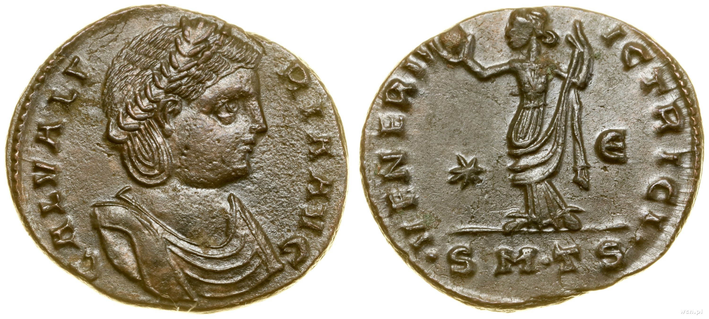 Aw: Popiersie cesarzowej w prawo, GAL VALERIA AVG, Rw: Wenus stojąca na wprost, trzymająca w dłoni jabłko i unosząca suknię, VENERI VICTRICI, w odcinku •SM•TS•, z lewej *, z prawej E