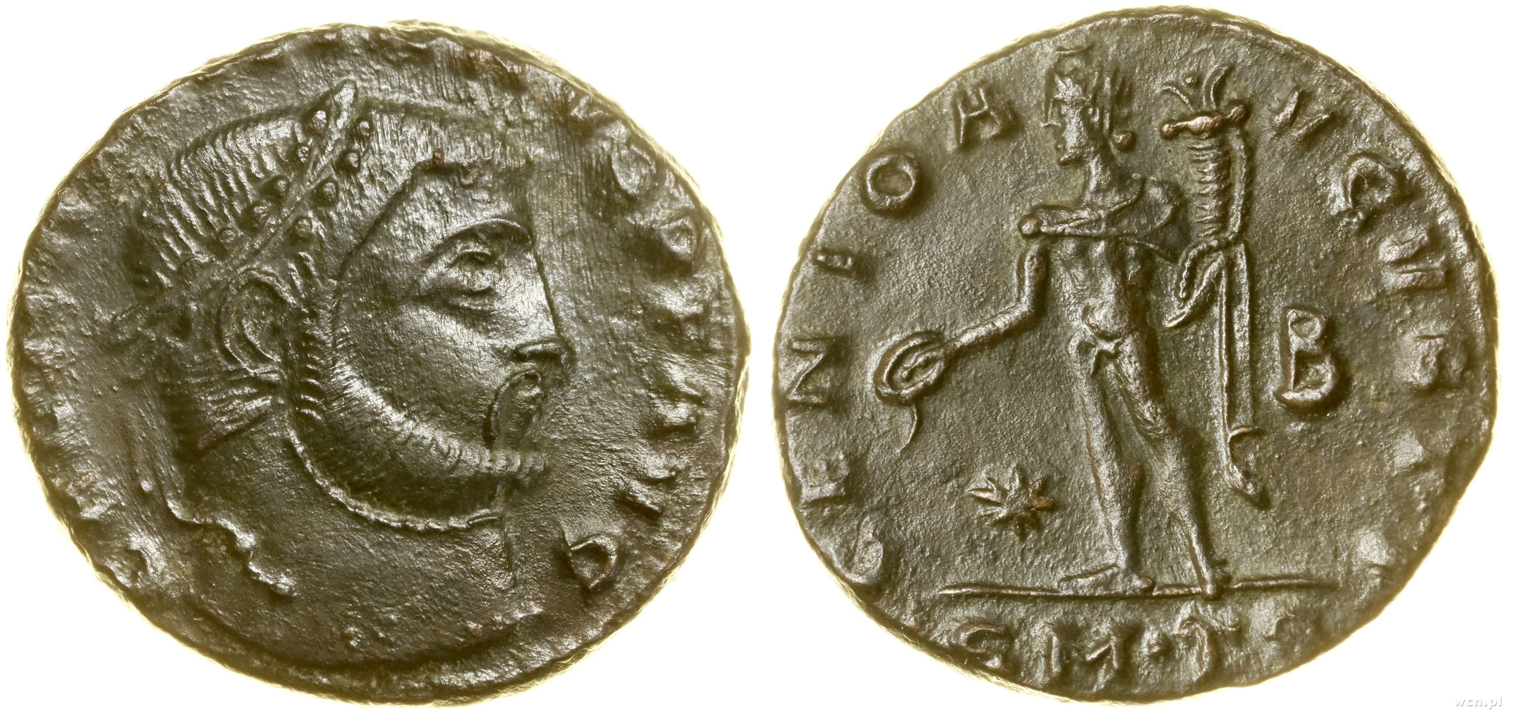Aw: Głowa cesarza w prawo, GAL MAXIMIANVS P F AVG; Rw: Geniusz stojący w lewo, trzymający paterę i róg obfitości, GENIO AVGVSTI, w odcinku SM TS, w polu gwiazda i litera B, w odcinku SM•TS