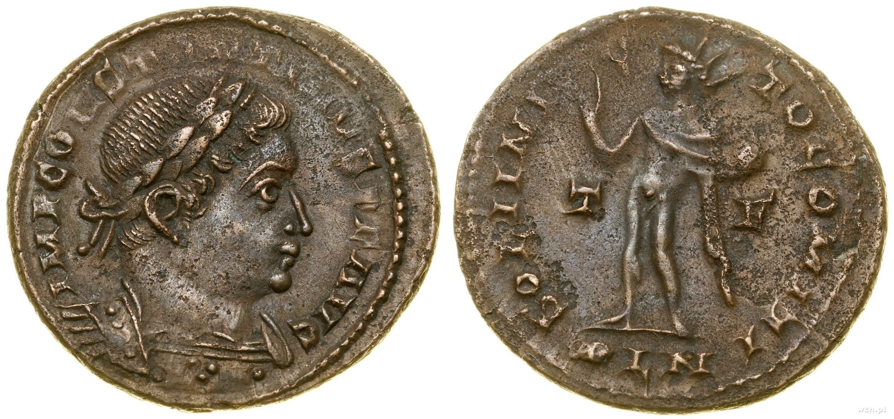 Aw: Popiersie cesarza w prawo, IMP CONSTANTINVS P F AVG, Rw: Sol stojący w lewo, trzymający glob oraz unoszący prawą dłoń, SOLI INVICTO COMITI, po bokach T - F, w odcinku PLN