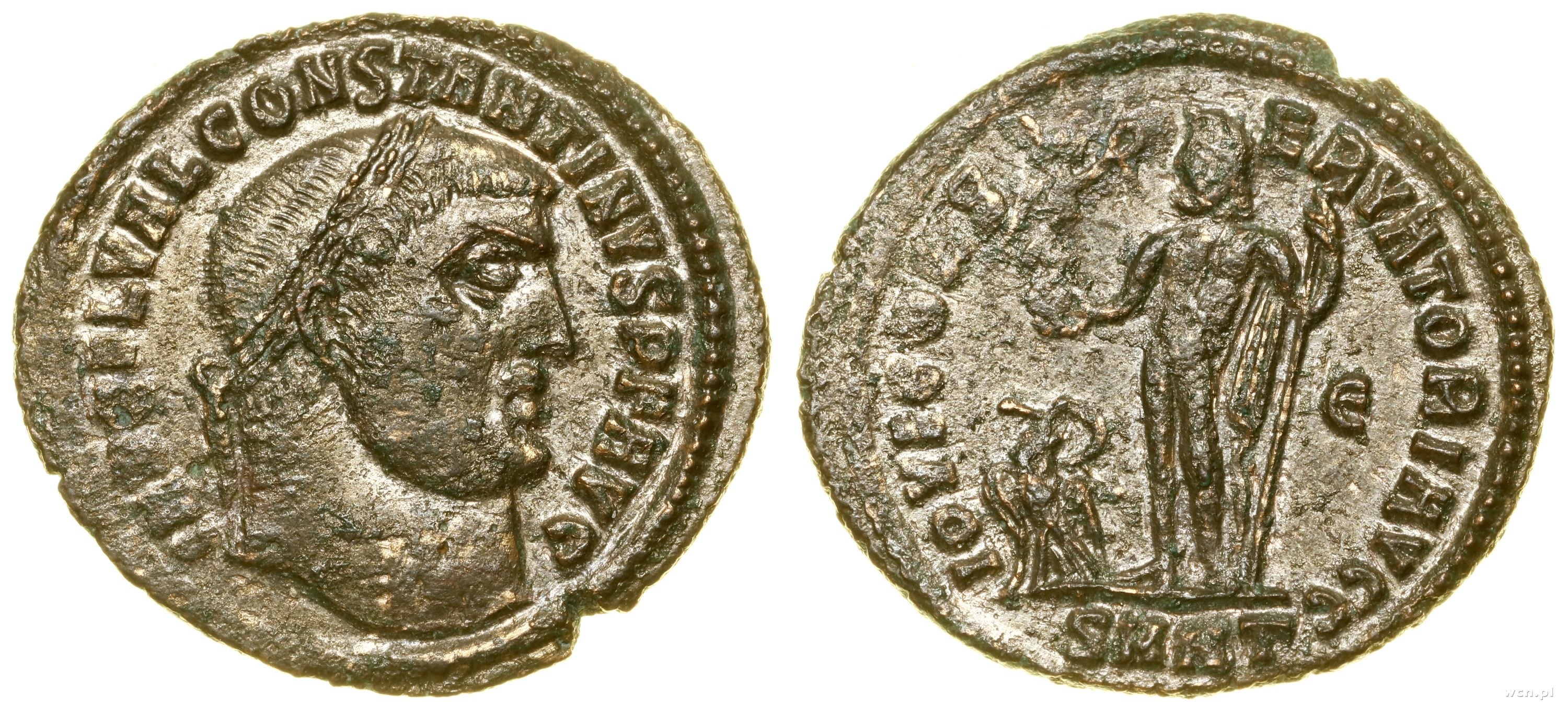 Aw: Głowa cesarza w prawo, IMP C FL VAL CONSTANTINVS P F AVG, Rw: Stojący Jowisz w prawo trzymający Wiktorię, u jego stóp Orzeł z wieńcem w dziobie, berło w lewej dłoni, w prawym polu E, IOVI CONSERVATORI AVGG, w odcinku SMHT