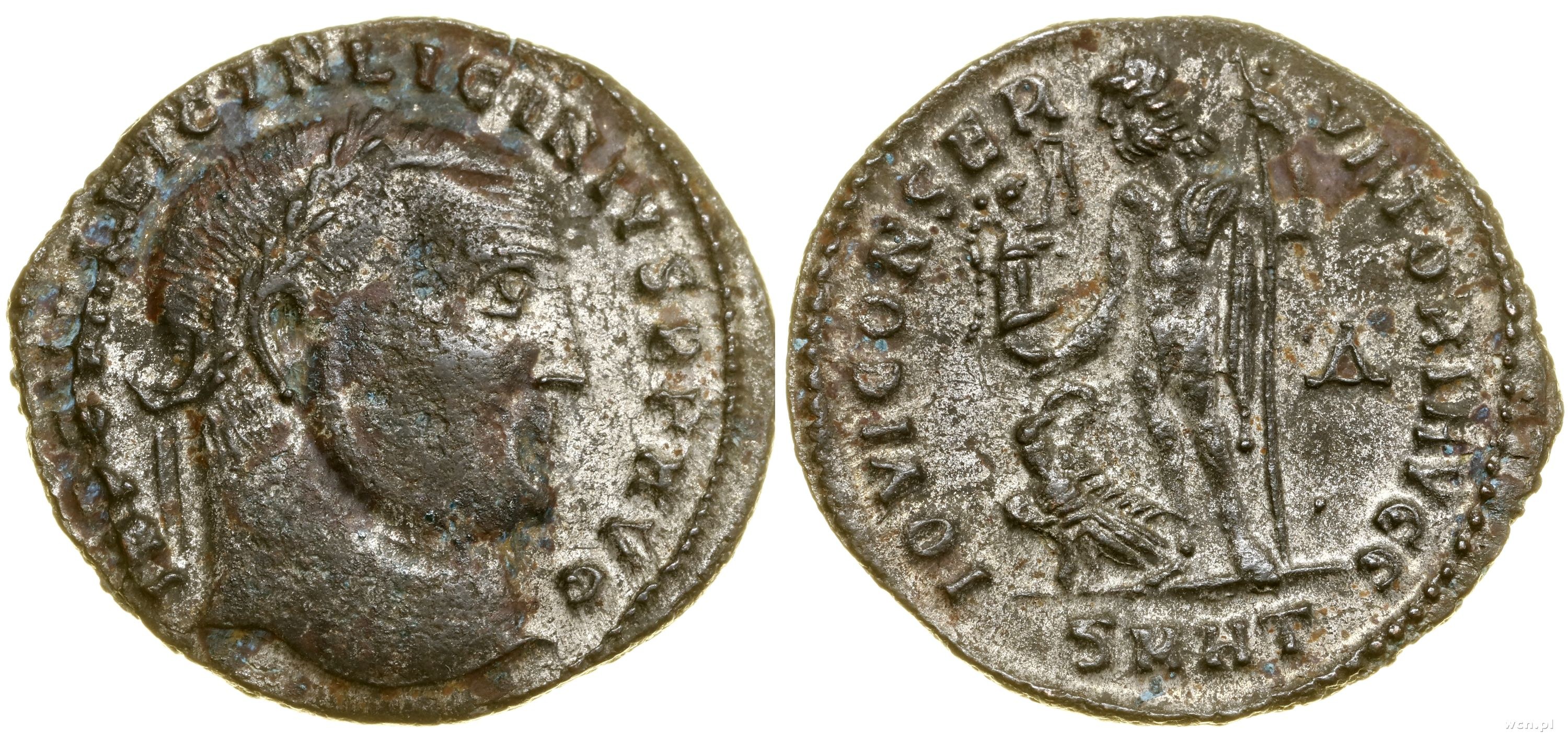 Aw: Popiersie w prawo, IMP C VAL LICIN LICINIVS P F AVG, Rw: Jowisz stojący w lewo, trzymający Wiktorię i berło, u jego stóp orzeł z wieńcem w dziobie, IOVI CONSERVATORI AVGG, w polu A, w odcinku SMHT