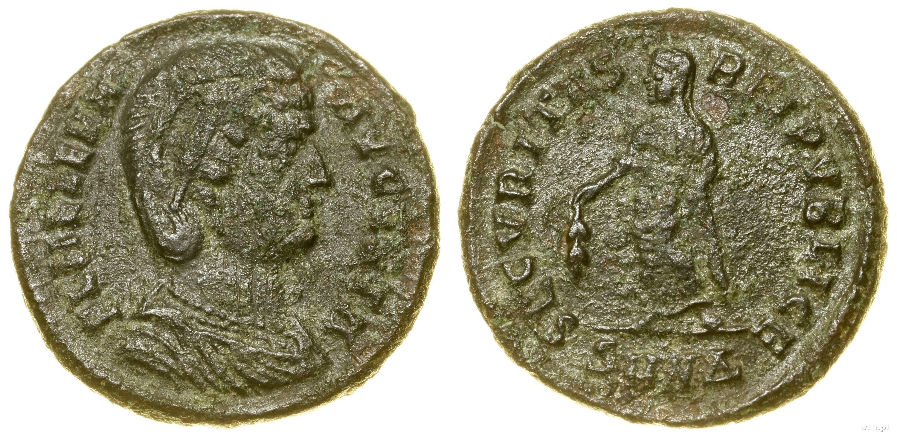 Aw: Popiersie cesarzowej w prawo, FL HELENA AVGVSTA; Rw: Securitas stojąca w lewo, trzymajca gałązkę oliwną, SECVRITAS REIPVBLICE, w odcinku SMNΔ