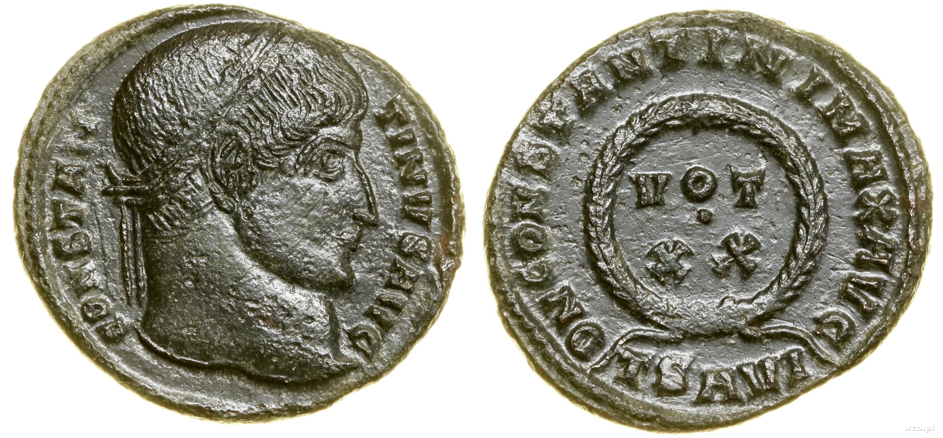 Aw: Głowa cesarza w prawo, CONSTANTINVS AVG; Rw: W wieńcu laurowym VOT XX, D N CONSTANTINI MAX AVG, w odcinku TSAVI