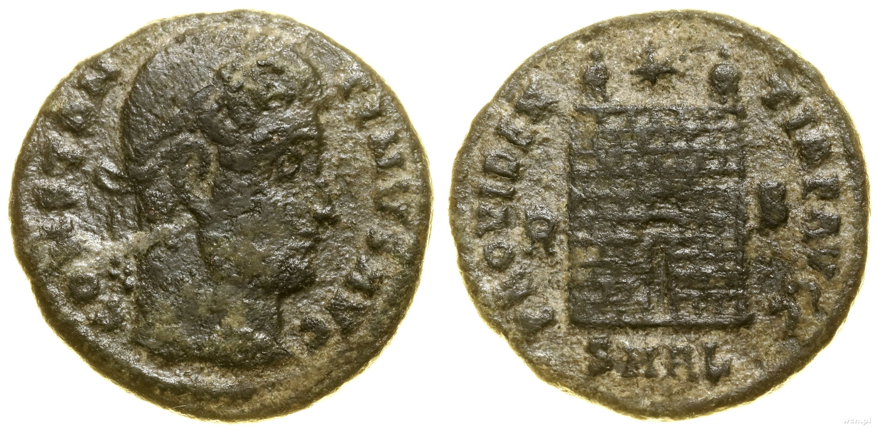 Aw: Popiersie władcy w prawo, CONSTANTINVS AVG, Rw: Brama obozowa, nad nią gwiazda, PROVIDENTIAE AVGG, po bokach wieniec i B, w odcinku SMAL
