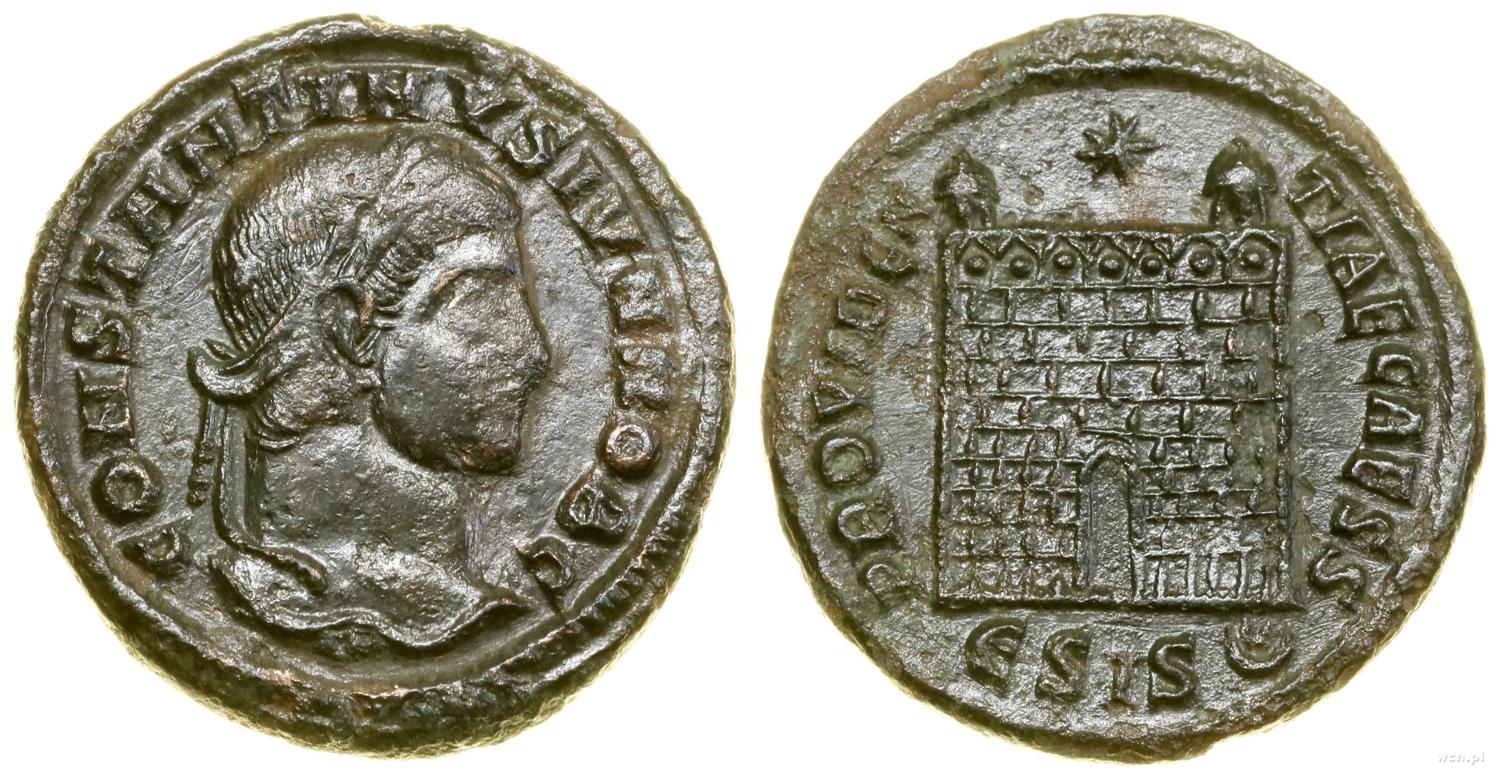 Aw: Popiersie cezara w prawo, CONSTANTINVS IVN NOB C, Rw: Brama obozowa, nad nią gwiazda, PROVIDENTIAE CAESS, w odcinku ESIS i półksiężyc