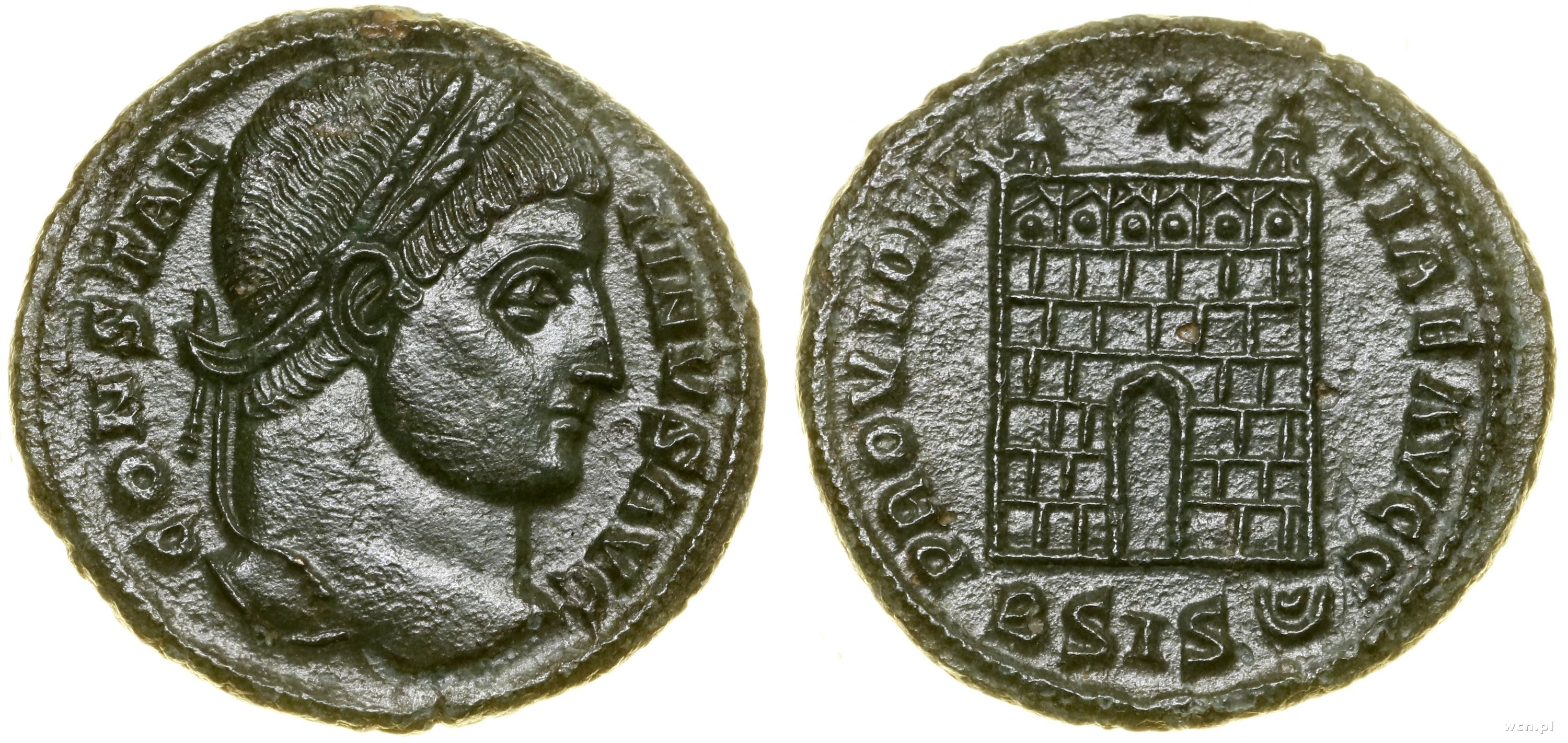 Aw: Głowa w prawo, CONSTANTINVS AVG, Rw: Brama obozowa, nad nią gwiazda, PROVIDENTIAE AVGG, w odcinku BSIS i półksiężyc