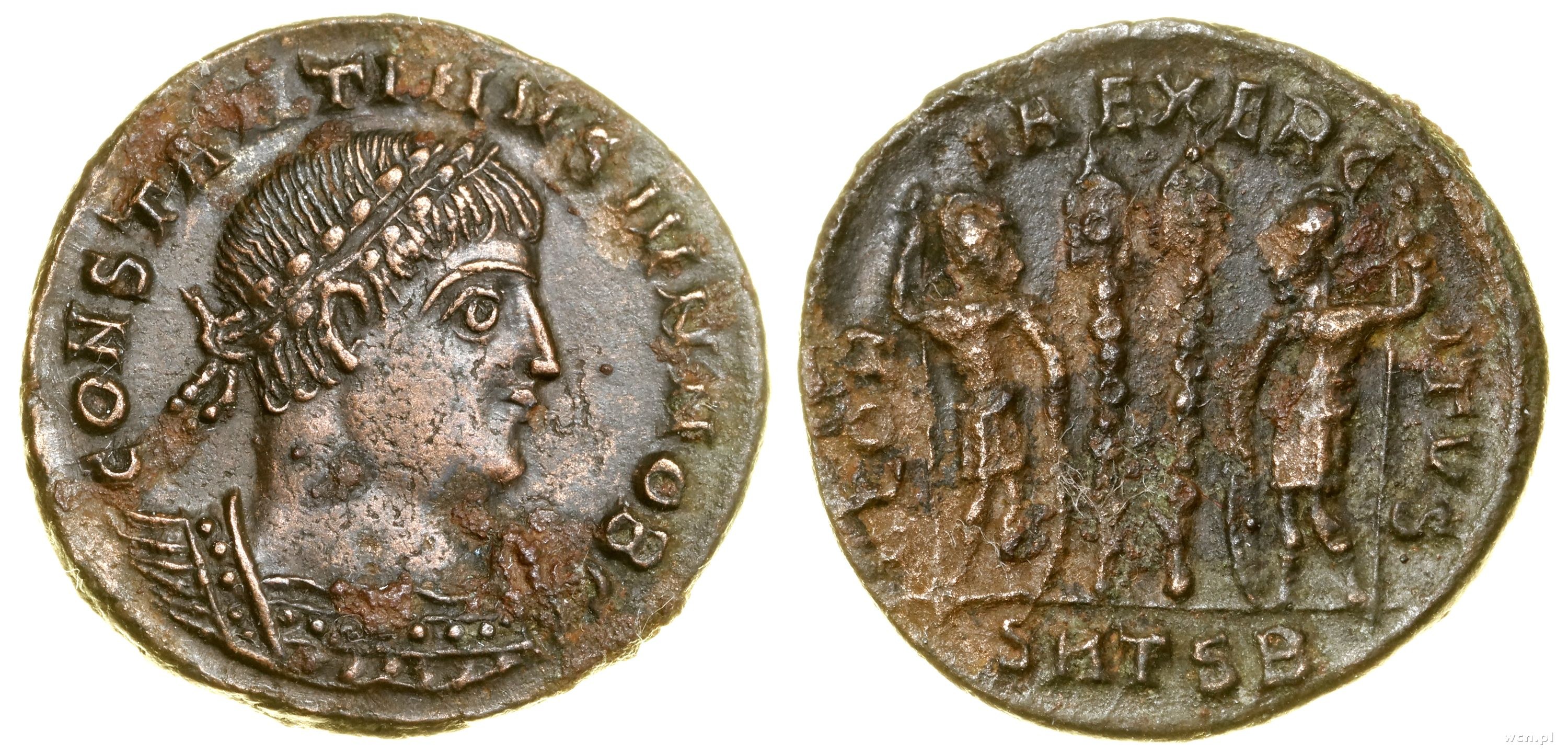Aw: Popiersie cezara w prawo, CONSTANTINVS IVN NOB C, Rw: Dwaj żołnierze z włóczniami, między nimi dwa sztandary legionowe, GLORIA EXERCITVS, w odcinku SMTSB