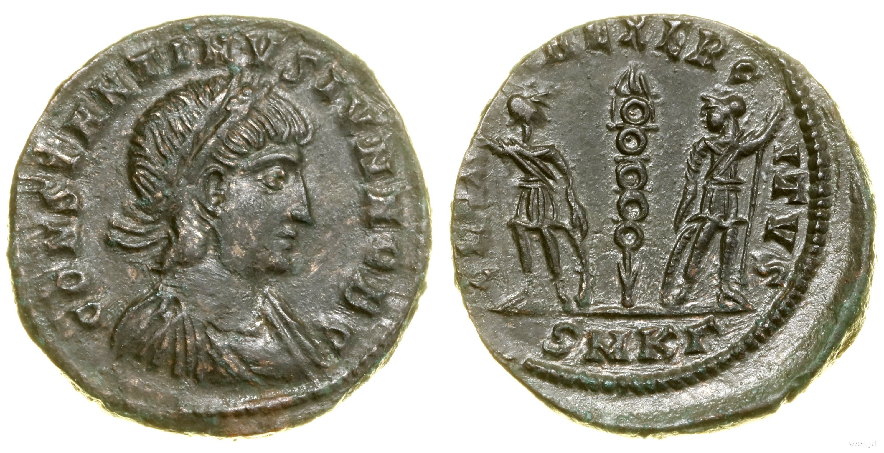 Aw: Popiersie cesarza w prawo, CONSTANTINVS IVN NOB C, Rw: Dwaj żołnierze, pomiędzy nimi sztandar GLORIA EXERCITVS, w odcinku SMKΓ