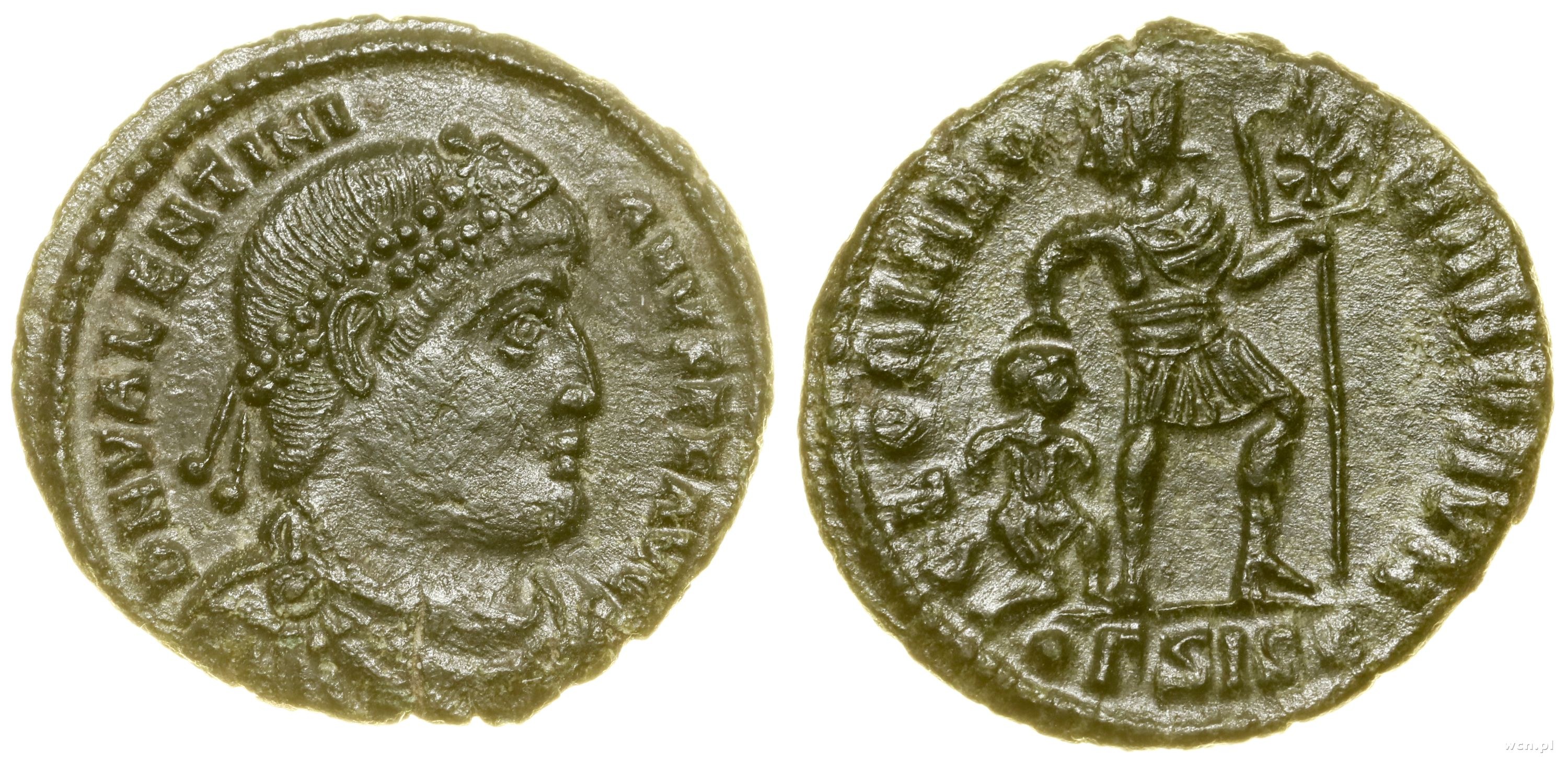 Aw: Popiersie cesarza w prawo, D N VALENTINIANVS P F AVG; Rw: Cesarz kroczący w prawo, trzymający labarum i ciągnący za sobą jeńca, GLORIA ROMANORVM, w odcinku ΓSISC