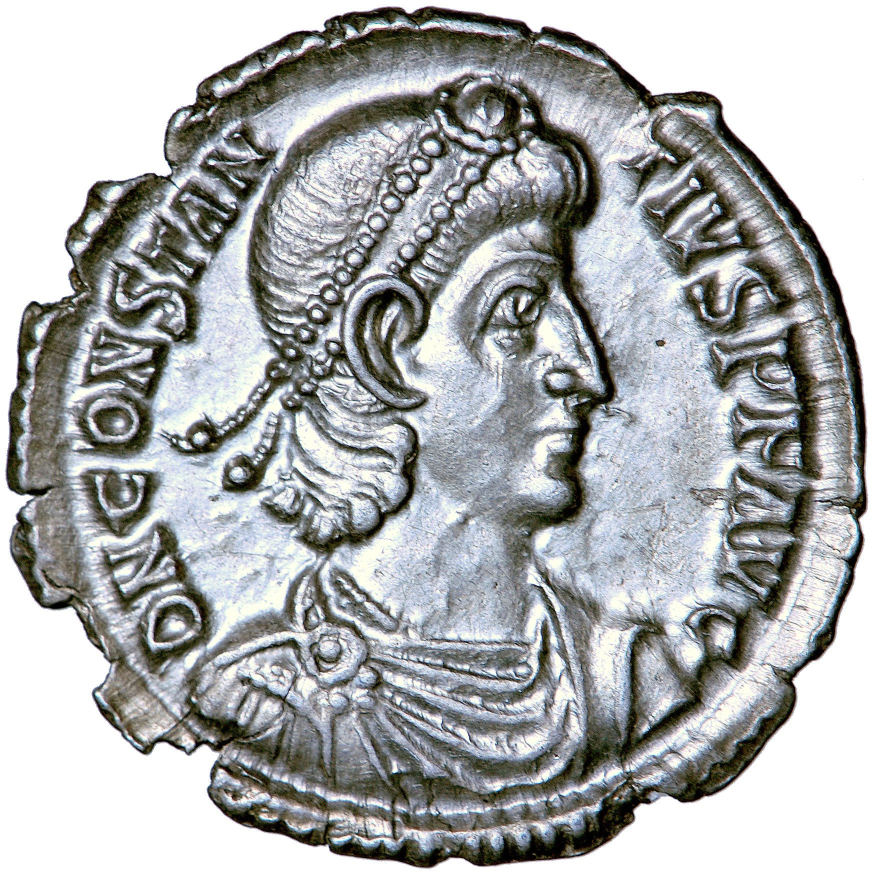 Av. Popiersie Konstancjusza II w diademie perełkowym, zbroi i płaszczu w prawo. DN CONSTAN - TIVS PF AVG.