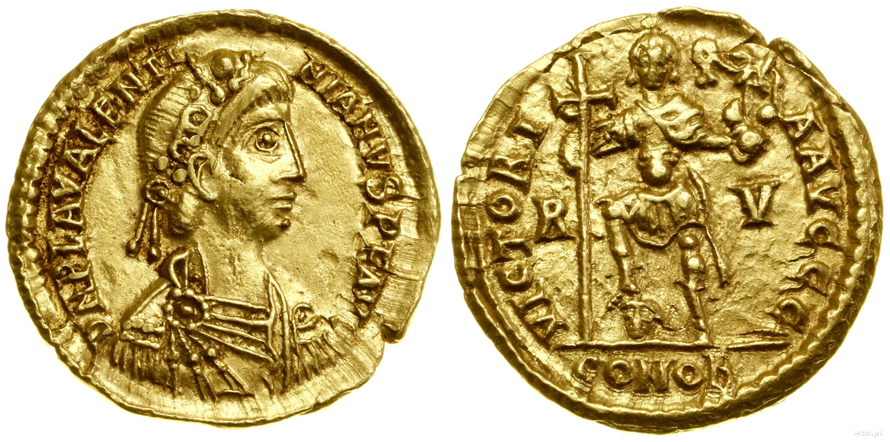 Aw: Popiersie cesarza w prawo, D N PLA VALENTINIANVS P F AVG; Rw: Cesarz stojący na wprost, trzymający długi krzyż i glob z Wiktorią, depczący ludzką głowę, w polu R-V, VICTORIA AVGGG, w odcinku CONOB