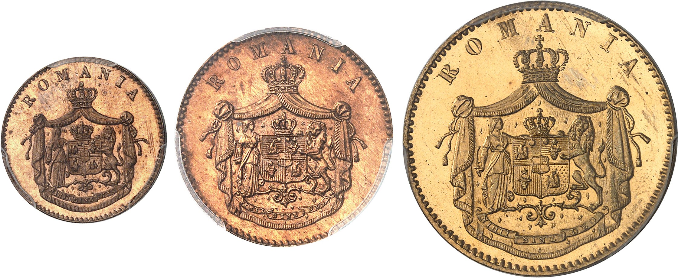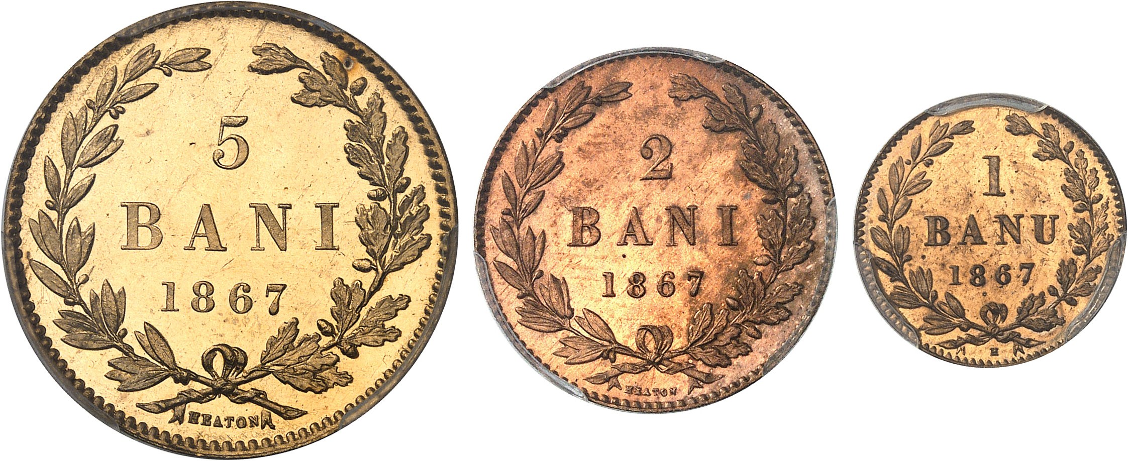 Charles Ier, Prince (1866-1881). Lot de 1 banu, 2 et 5 bani, Frappes spéciales (SP) 1867, Heaton. PCGS SP65RD (49960537, 0538 et 0539).