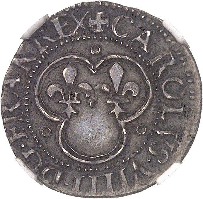 Av. + CAROLVS. VIIII. D: G. FRAN REX. deux lis dans un trilobe cantonné de trois annelets.