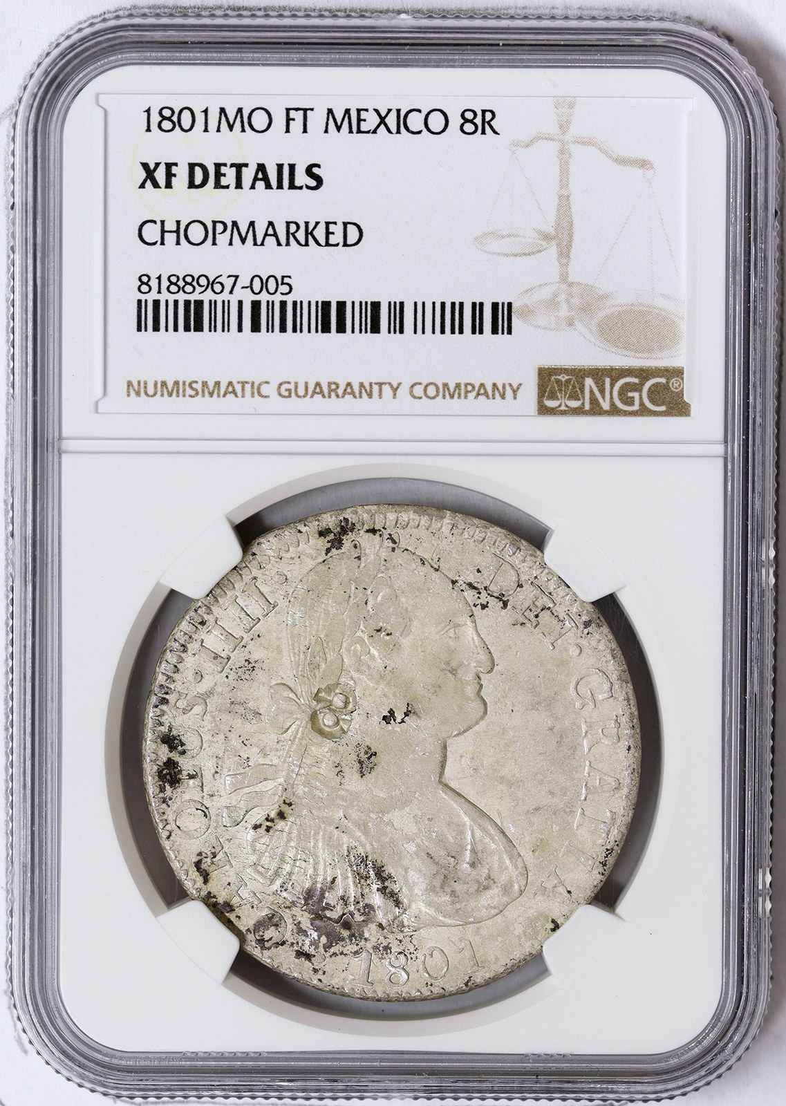 FT Flashy silver despite the cloudy toning interesting boldly struck "8" chop on the obv. Ag.896 27,07 g