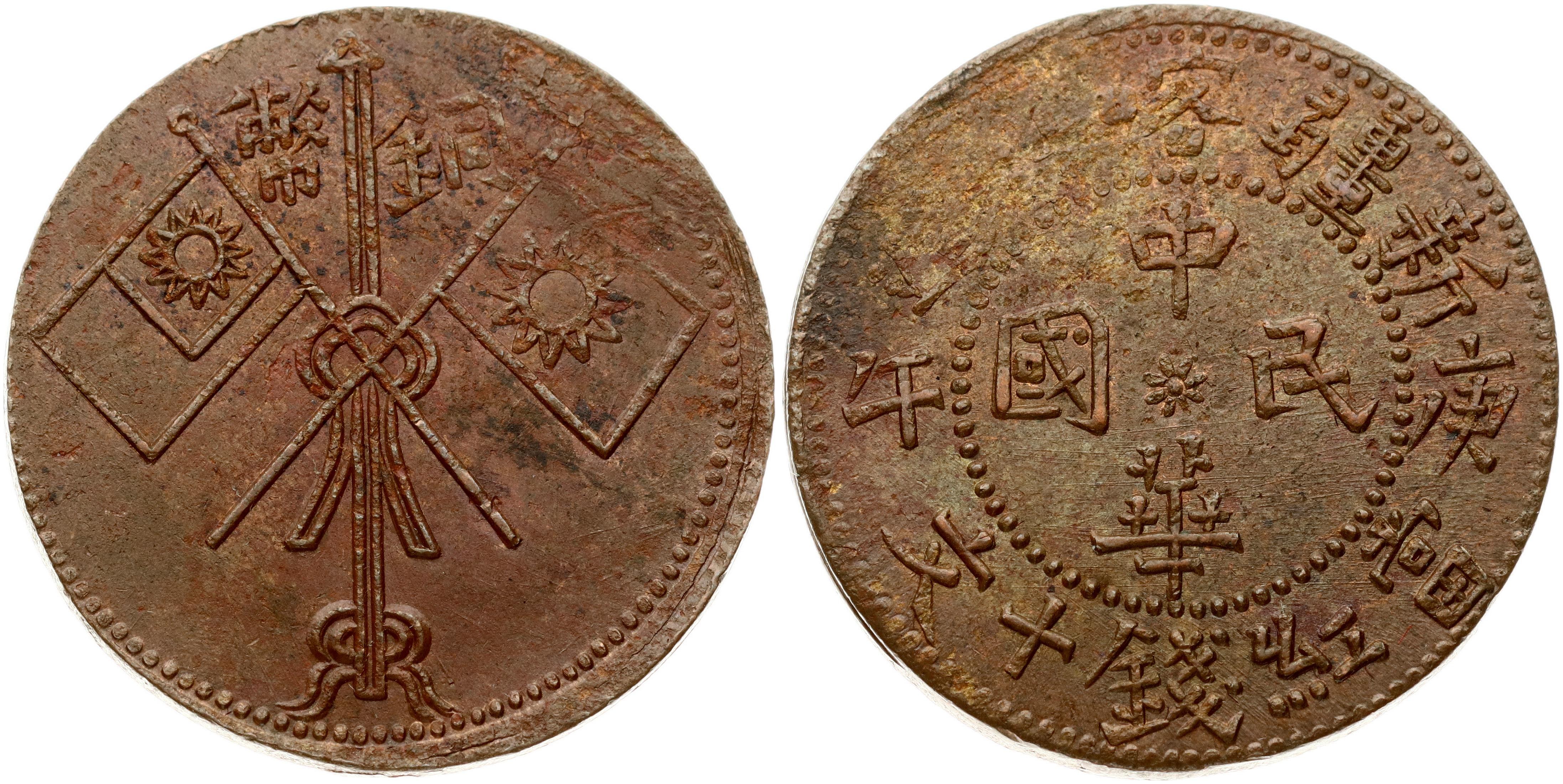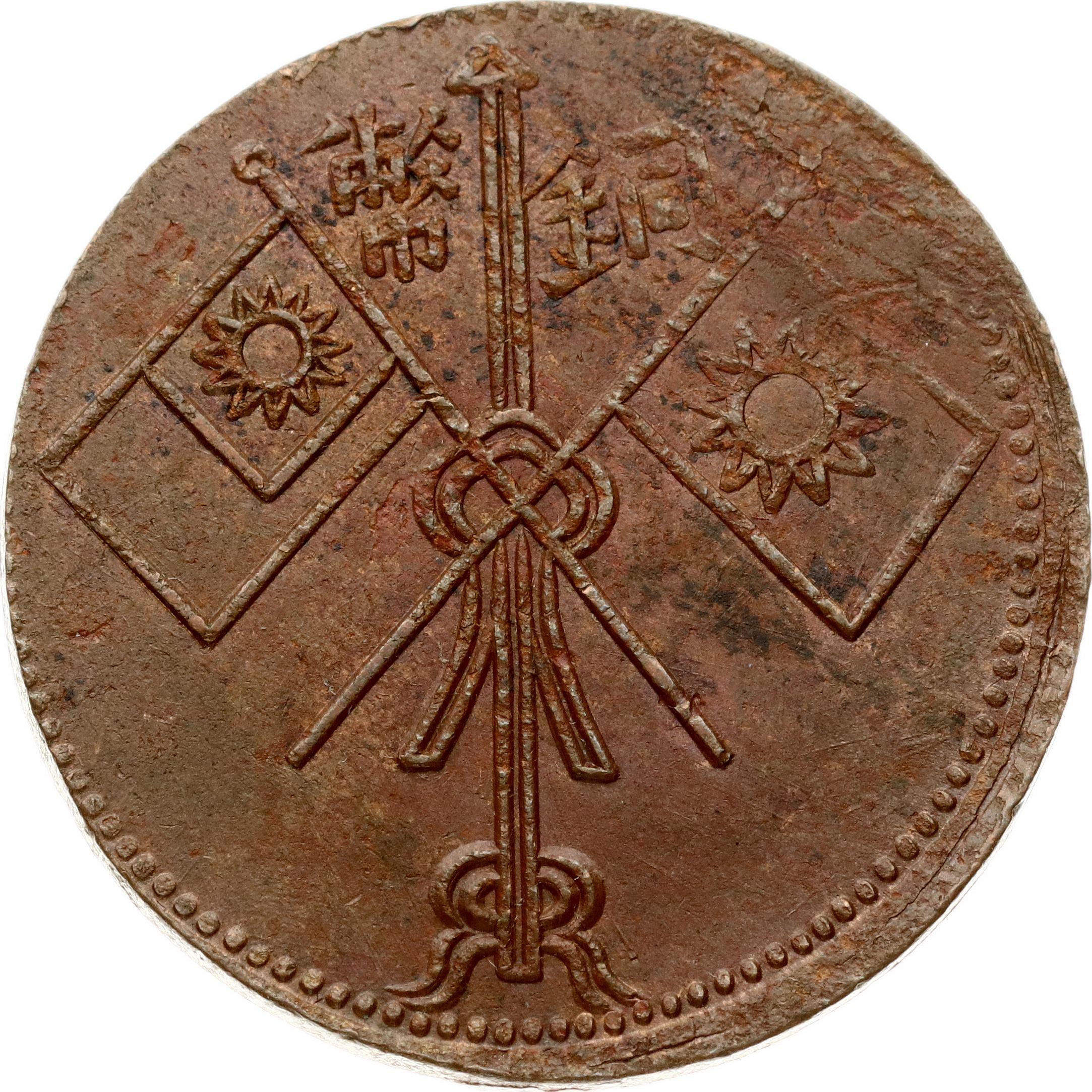 China Sinkiang Province 10 Cash ND(1930) Kashgar. Obverse: Four Chinese ideograms read top to bottom; right to left; all surrounded by more ideograms. Reverse: Two crossed flags with line through the centre; ribbon where they intersect; and bowl below; all with two Chinese ideograms above. Copper 13.80g. Y-44