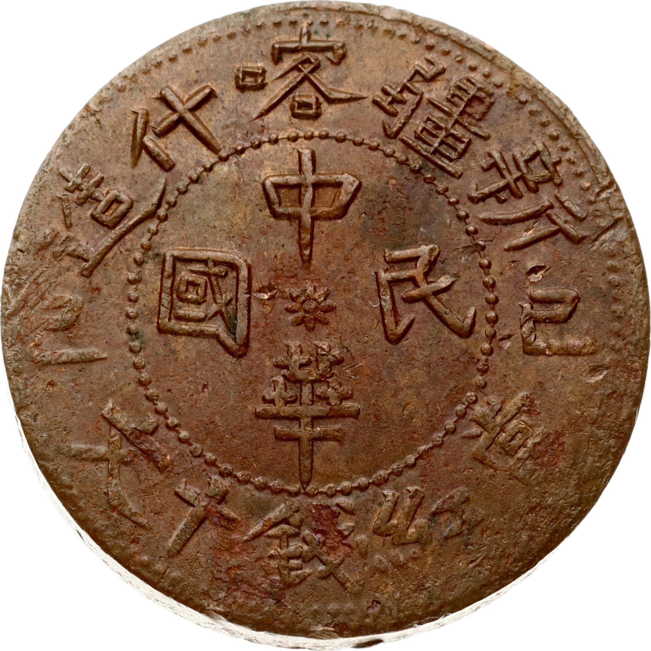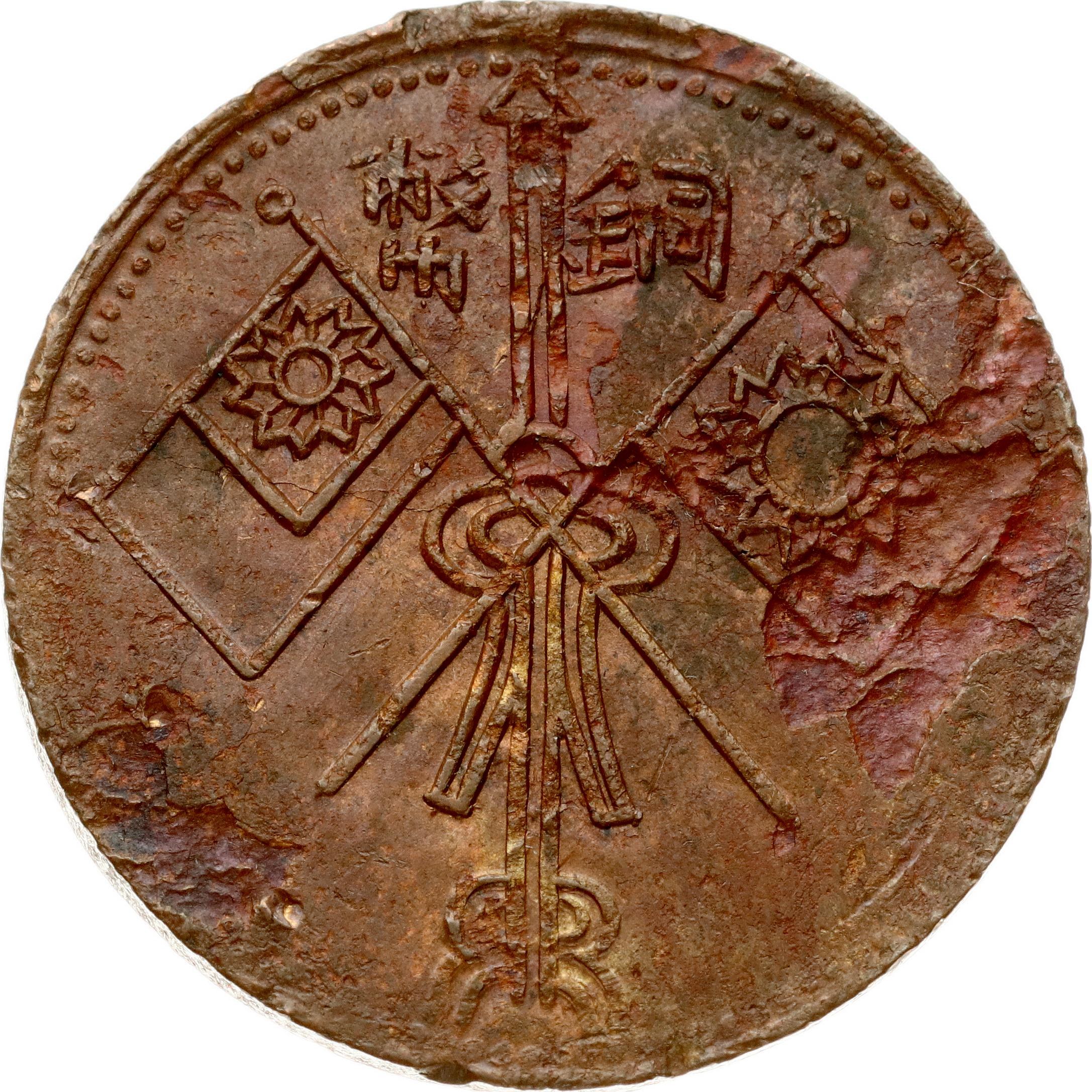China Sinkiang Province 10 Cash ND(1930) Kashgar. Obverse: Four Chinese ideograms read top to bottom; right to left; all surrounded by more ideograms. Reverse: Two crossed flags with line through the centre; ribbon where they intersect; and bowl below; all with two Chinese ideograms above. Copper 14.70g. Surface damage. Y-44