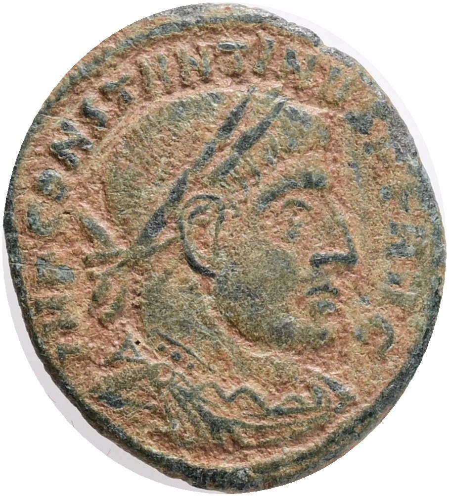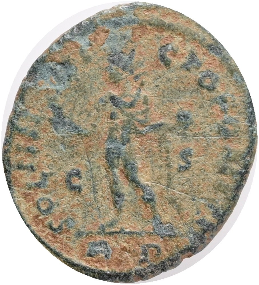 CONSTANTINE I. 307-337 AD. Æ Follis .Obv.: CONSTANTINVS P F AVG, laureate and cuirassed bust right. Rev.: SOLI INVIC-TO COMITI, Sol standing left, raising right hand and holding globe in left. AE 3g