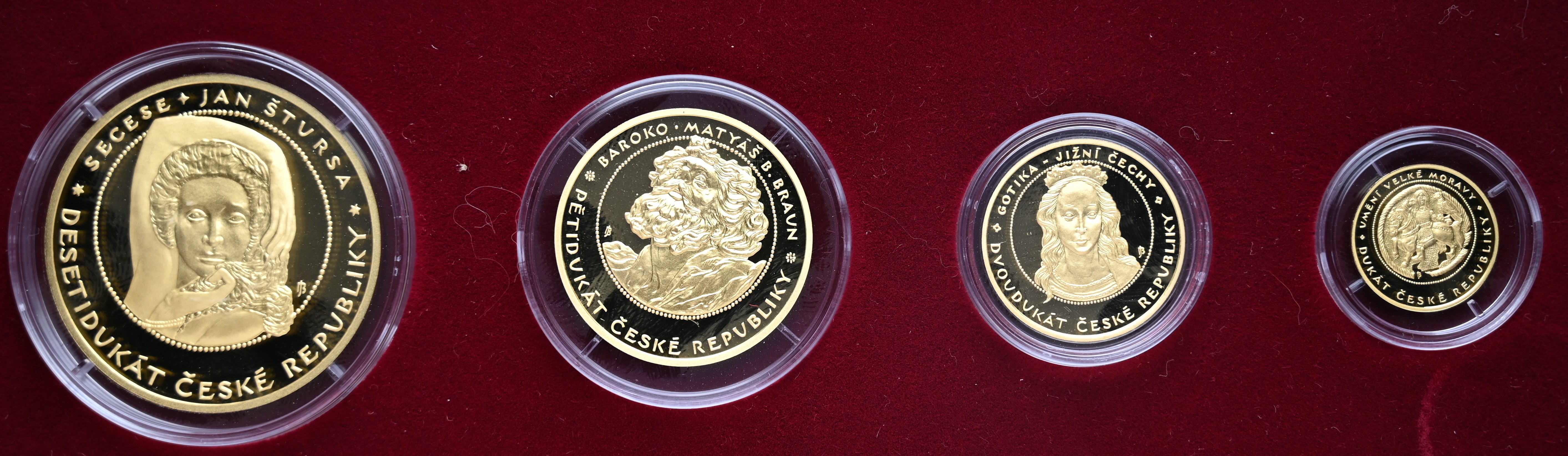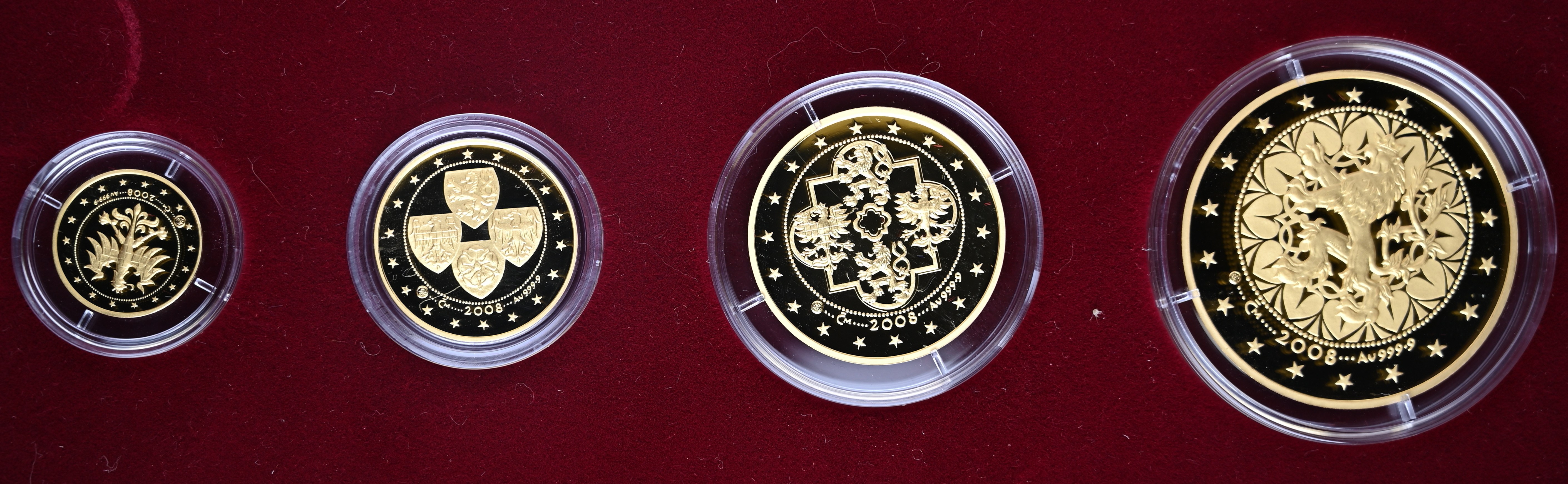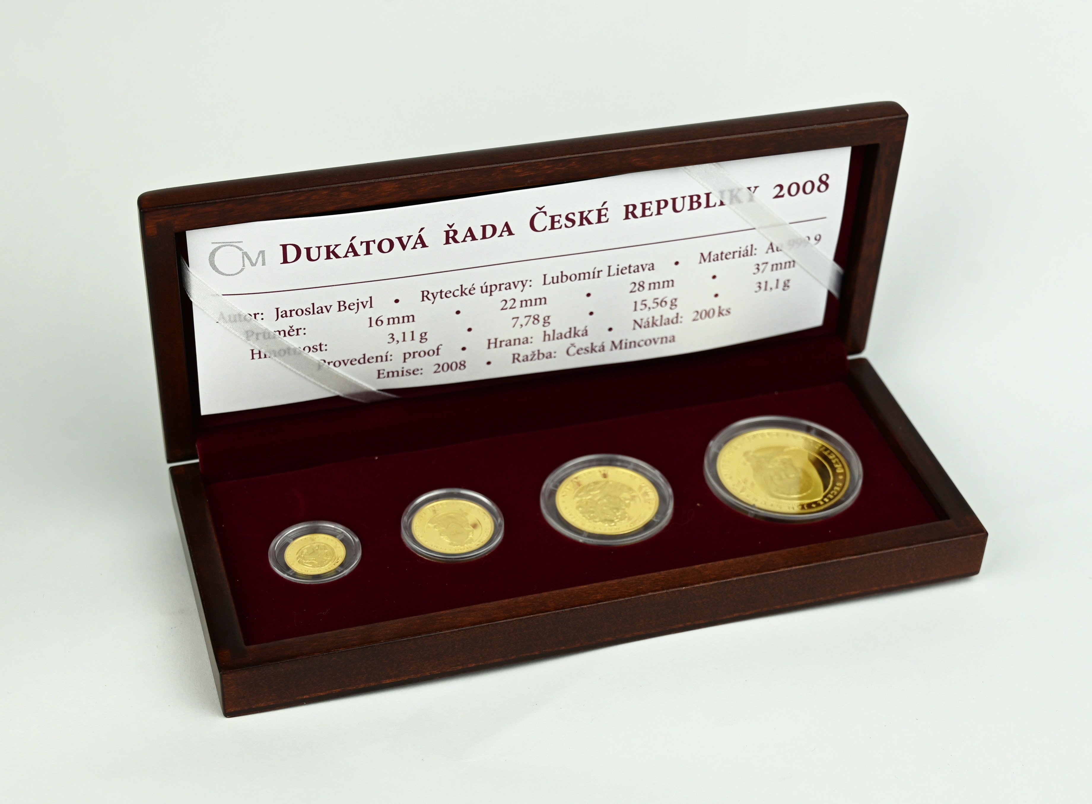 ČR, Dukátová řada ČR 2008, Proof, 10, 5, 2, 1 dukát, Au 999,9/1000, 31,1 + 15,56 +7,78 + 3,11 g, 37 + 28 + 22 +16 mm, náklad 200 ks, autor J. Bejvl, Česká mincovna