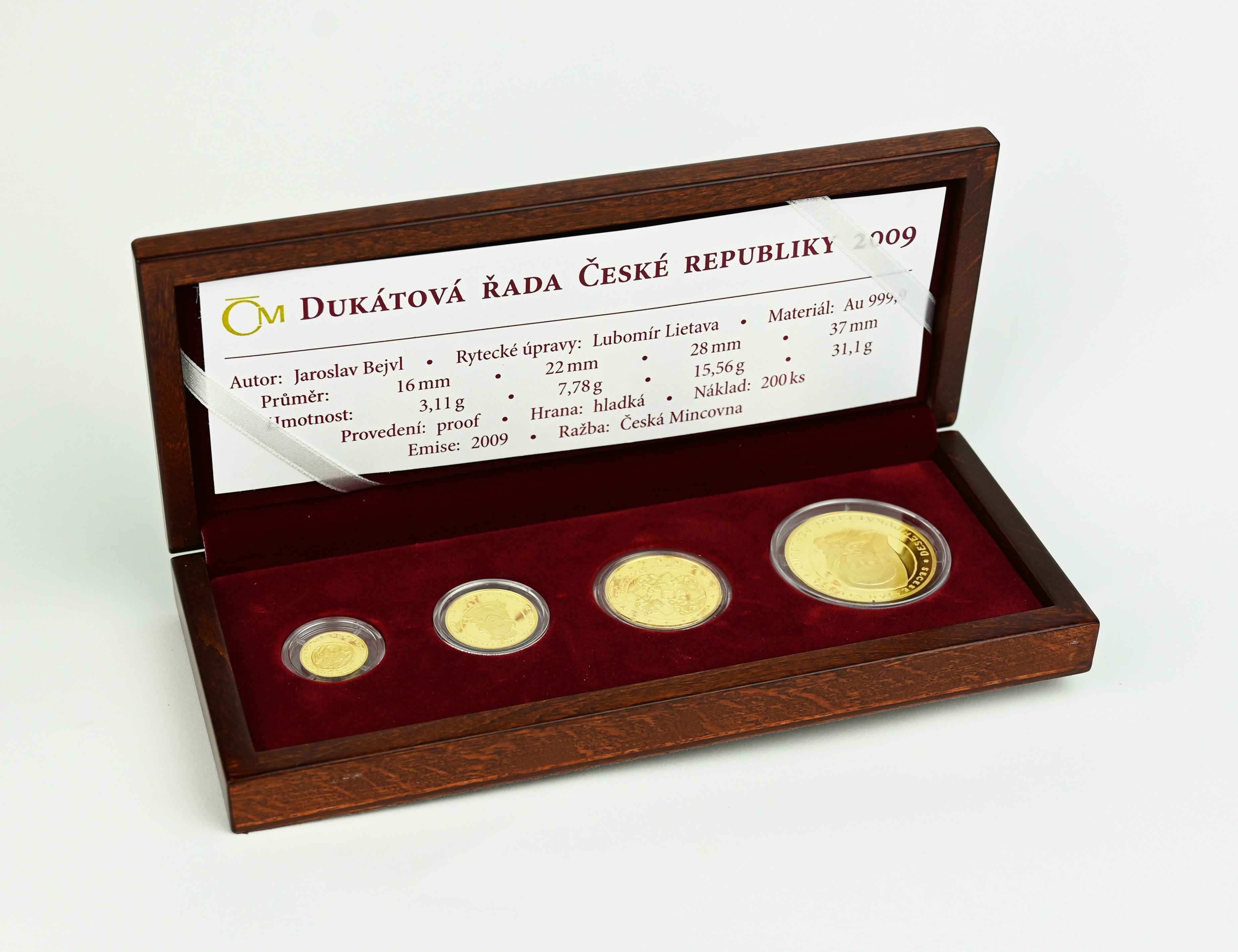 ČR, Dukátová řada ČR 2009, Proof, 10, 5, 2, 1 dukát, Au 999,9/1000, 31,1 + 15,56 +7,78 + 3,11 g, 37 + 28 + 22 +16 mm, náklad 200 ks,autor J. Bejvl, Česká mincovna