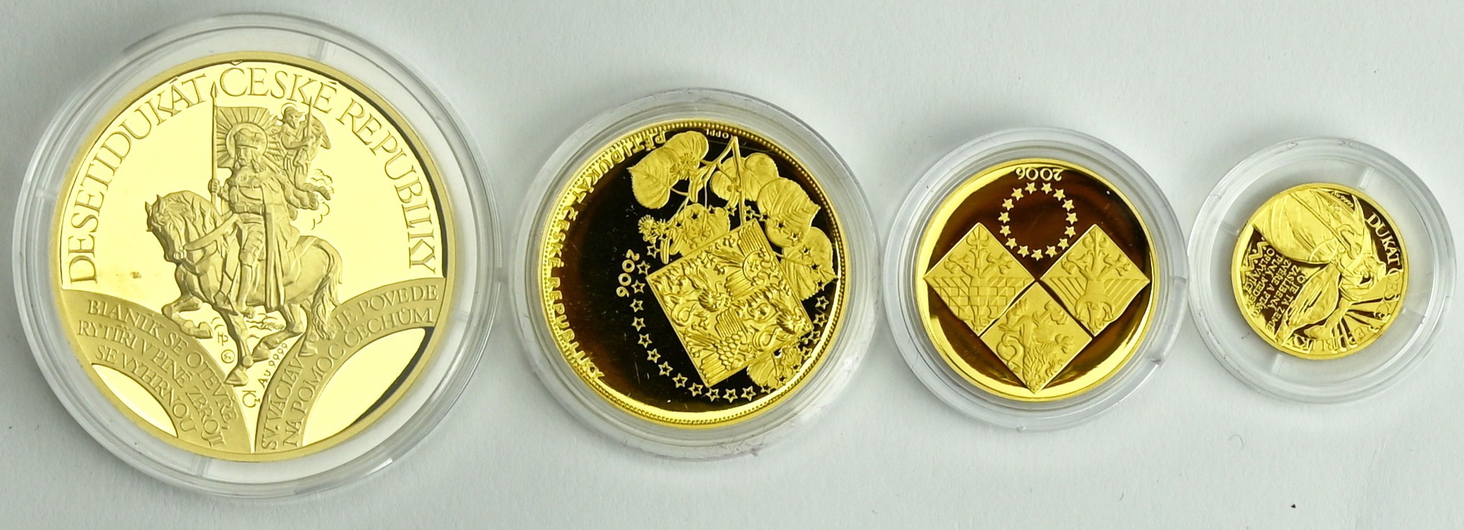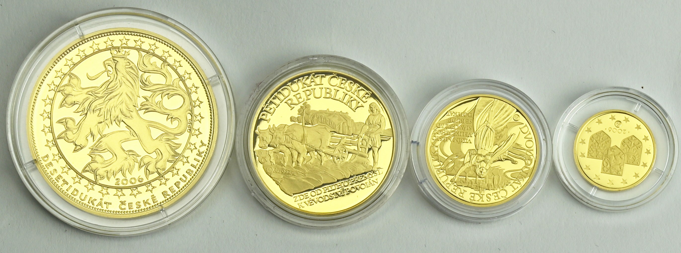 ČR, Sada Dukátů, 1, 2, 5, 10 Dukát, 2006, Proof, Česká Mincovna, 37 mm, 31,1 g, Au 999,9/1000, 28 mm, 15,56 g, 22 mm, 7,78 g, 16 mm, 3,11 g, P. Horák, V. Oppl, L. Lietava