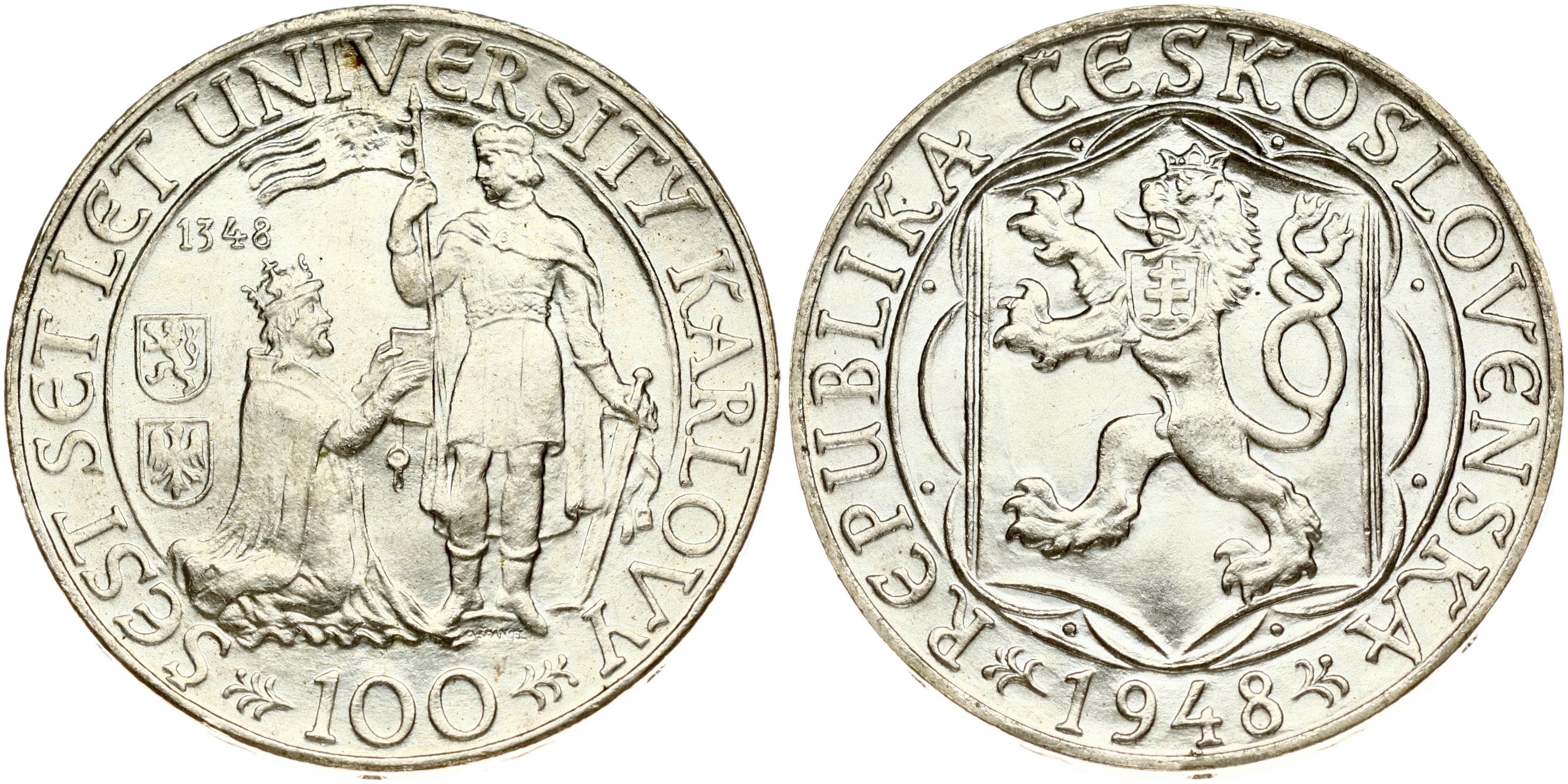 Czechoslovakia 100 Korun 1948 600th Anniversary of foundation of Charles University. Obverse: Coat of arms of Czechoslovakia. Reverse: Emperor Charles IV kneeling before Duke Wenceslas; shields at left. Edge Smooth with ornament with waves and stars. Silver (.500) 13.85g. KM-26