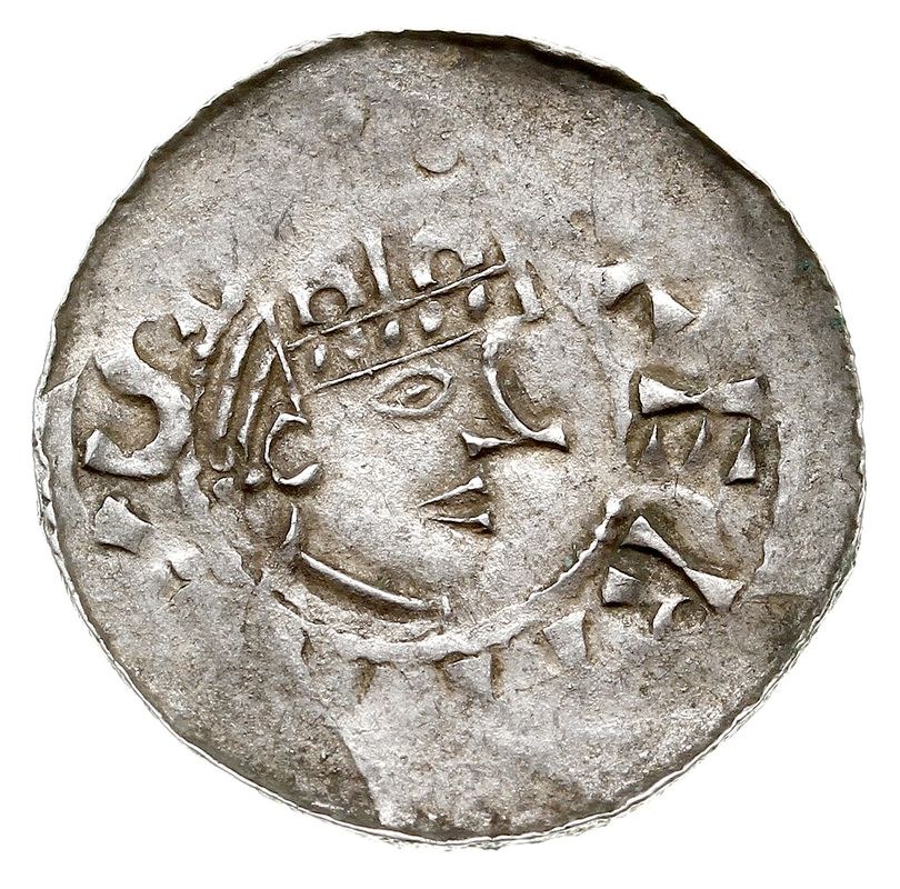 denar 1009-1014, Aw: Głowa w koronie w prawo, Rw: Dłoń ...