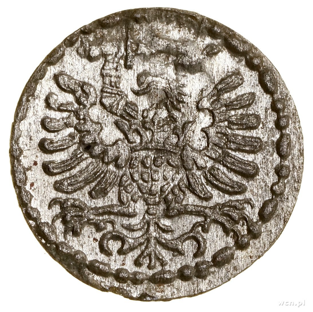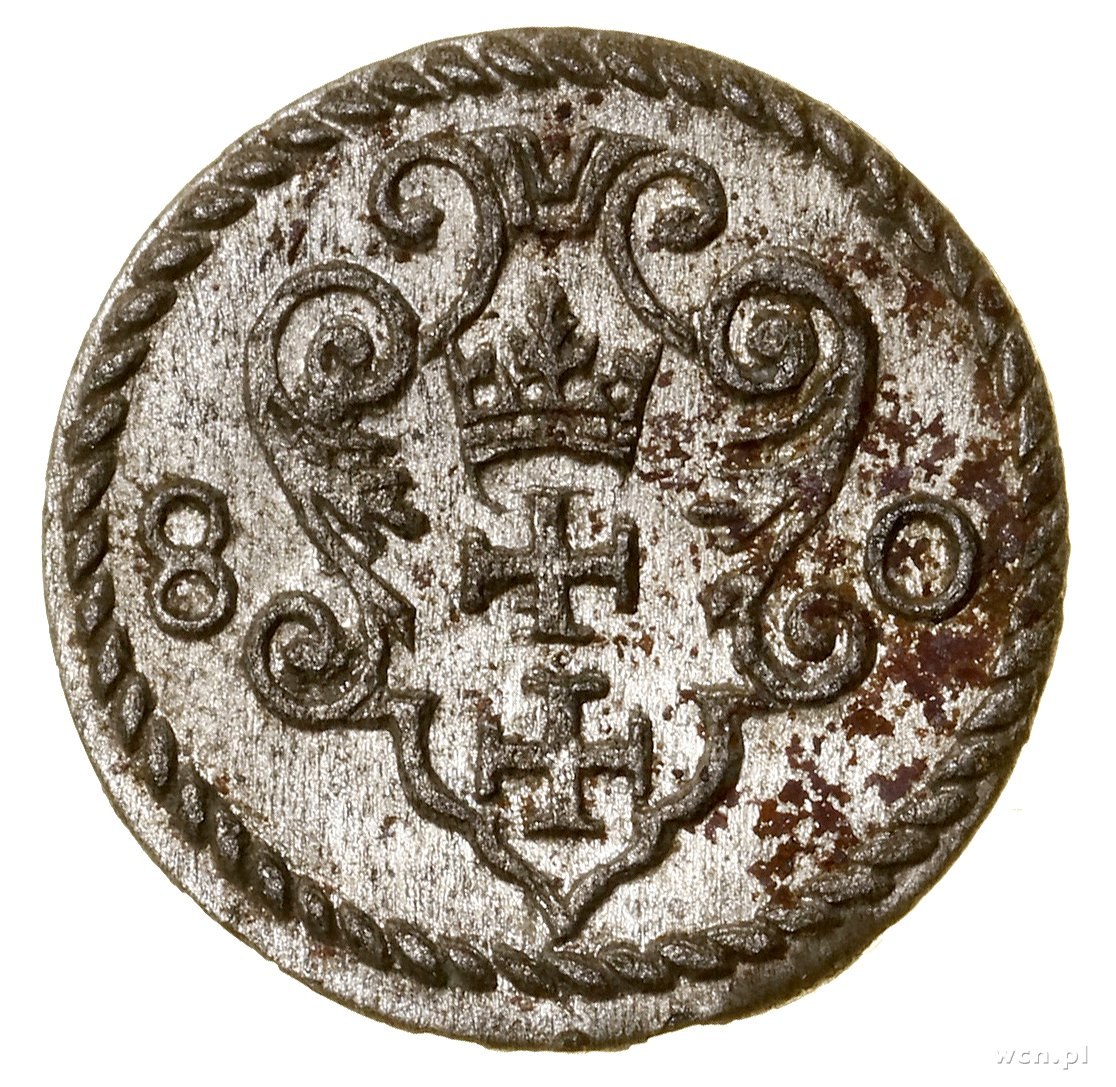 miasto Gdańsk, Denar, 1580, Gdańsk; CNG 126.II, Kop. 7417 (R4), Kurp. (1576–1586) 365 (R3), Parchimowicz Batory 167.c, Tyszkiewicz 4 mk; bardzo ładnie zachowany, z blaskiem menniczym.