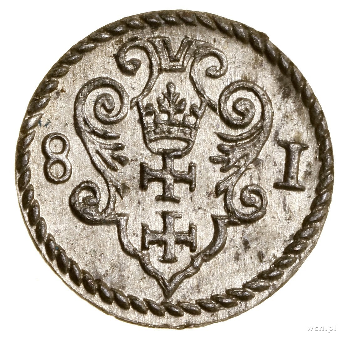 miasto Gdańsk, Denar, 1581, Gdańsk; CNG 126.III, Kop. 7419 (R3), Kurp. (1576–1586) 367 (R3), Parchimowicz Batory 167.d, Tyszkiewicz 4 mk; głęboki blask menniczy, pięknie zachowana moneta.