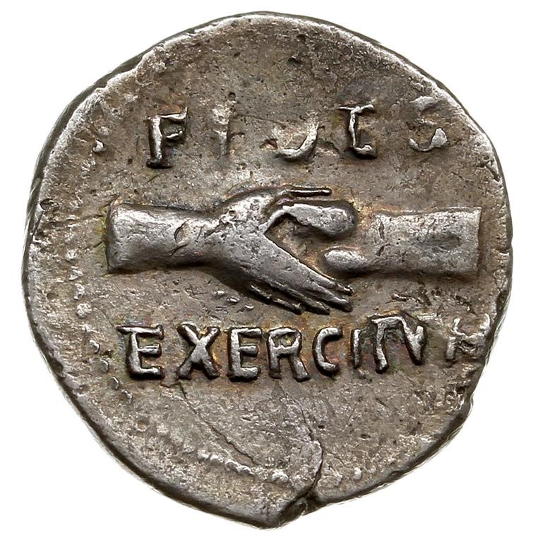 Witeliusz 69, denar 69, Rzym, Aw: Głowa w prawo, A VITELLIVS GERMANICVS IMP, Rw: Dwie uściśnięte dłonie, u góry FIDES, u dołu EXERCITVVM, srebro 3.49 g, RIC 67; RSC 36, zadrapanie na awersie, rzadki