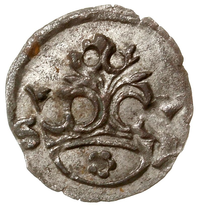 denar bez daty, Kraków; litery S-P po bokach korony, we...