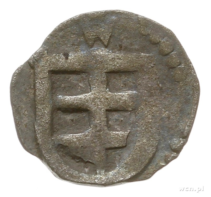 Władysław Jagiełło 1386-1434, denar koronny, Wschowa; Aw: Zaledwie widoczne fragmenty Orła; Rw: Tarcza z podwójnym krzyżem i literą W; Gum.H. 410, Kop. 8412-8420, Frynas P.16.3 lub P.16.6; srebro 0.34 g, słabo odbity stempel awersu