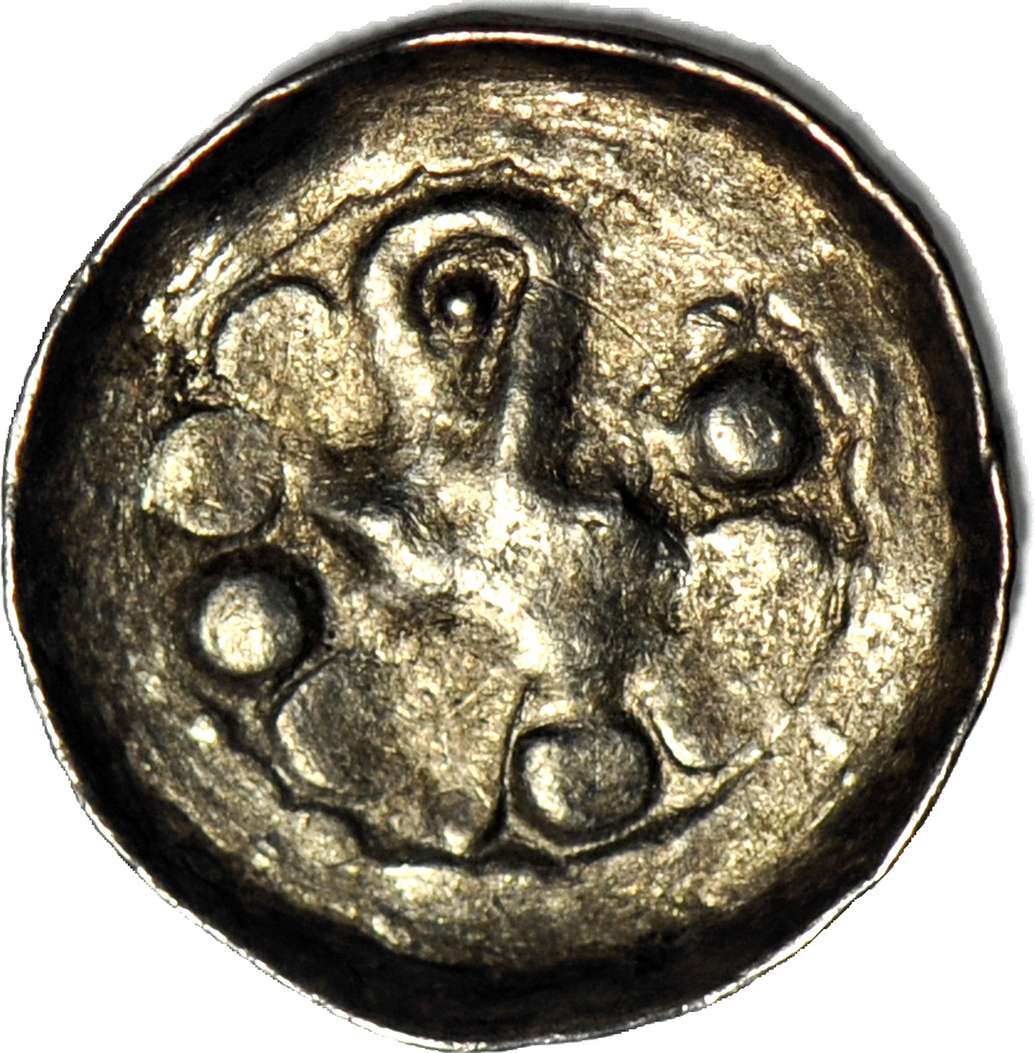 Denar krzyżowy XIw, pastorał/krzyż maltański i kule