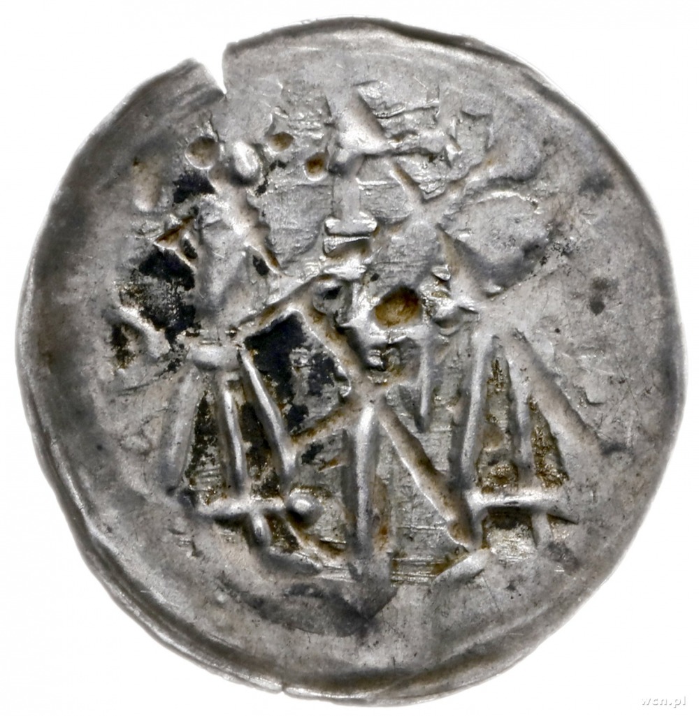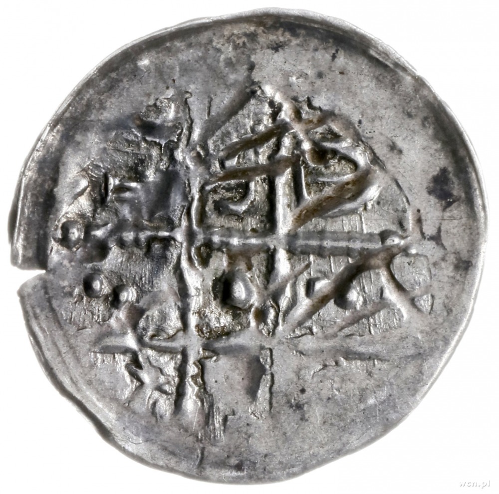 denar ok. 1185/90-1201, men. Wrocław; Aw: W 6 polach dw...